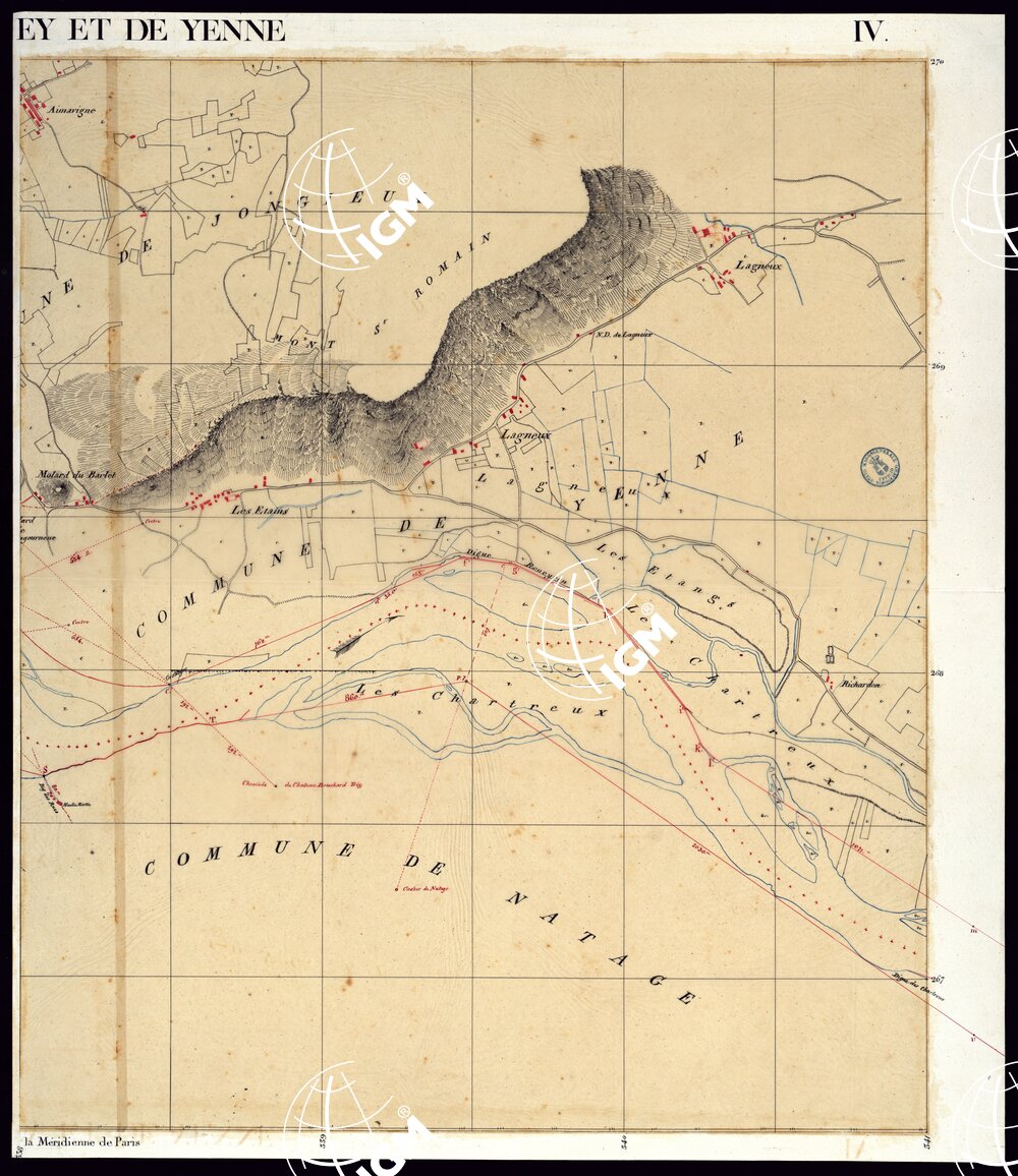 Disegno a penna su carta lucida, probabilmente copia di un disegno originale. La carta si compone di 21 fogli (dei quali i primi 4 in due parti) ed un quadro d’unione per cui complessivamente consta di 26 grandi fogli non totalmente riempiti. E’ riprodotto il corso del Rodano da un punto a circa 2 km. a monte di Anglefort sino alla confluenza del Guiers ed il corso di quest’ultimo sino al Pont Saint Martin poco a monte di Les Echelles. Il disegno è in azzurro per le acque, in rosso per i fabbricati, le dighe, il confine e le misure di riferimento; in nero per la rete stradale, il tratteggio orografico e le scritture. Il Quadro d’Unione alla scala di 1:100.000 porta in calce un elenco di 42 posizioni determinate per le loro coordinate rettangolari riferite alla meridiana ed alla perpendicolare di Parigi in base alle quali è tracciato il reticolato cassiniano della Carta. Documento interessante per la topografia storica dei fiumi rappresentati.