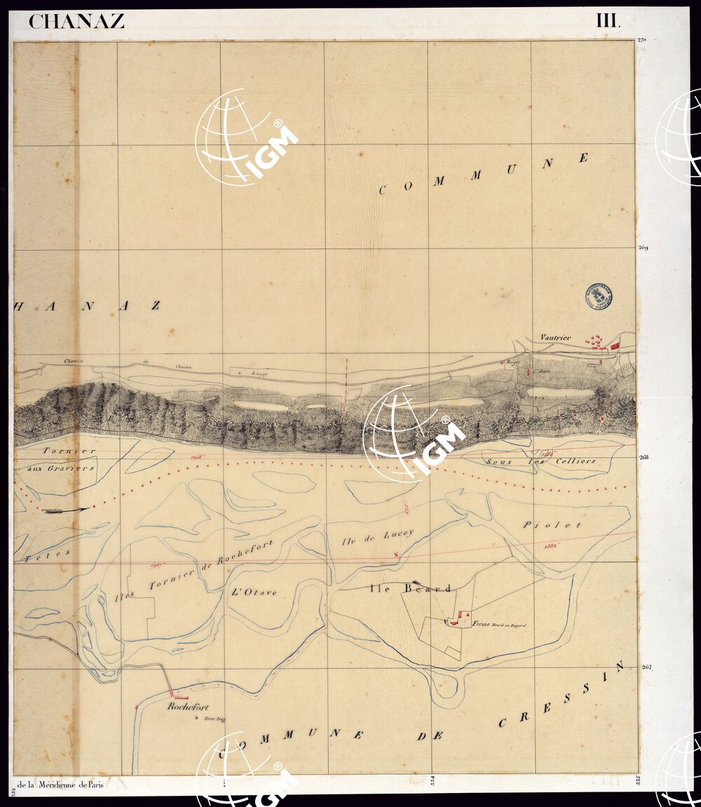 Disegno a penna su carta lucida, probabilmente copia di un disegno originale. La carta si compone di 21 fogli (dei quali i primi 4 in due parti) ed un quadro d’unione per cui complessivamente consta di 26 grandi fogli non totalmente riempiti. E’ riprodotto il corso del Rodano da un punto a circa 2 km. a monte di Anglefort sino alla confluenza del Guiers ed il corso di quest’ultimo sino al Pont Saint Martin poco a monte di Les Echelles. Il disegno è in azzurro per le acque, in rosso per i fabbricati, le dighe, il confine e le misure di riferimento; in nero per la rete stradale, il tratteggio orografico e le scritture. Il Quadro d’Unione alla scala di 1:100.000 porta in calce un elenco di 42 posizioni determinate per le loro coordinate rettangolari riferite alla meridiana ed alla perpendicolare di Parigi in base alle quali è tracciato il reticolato cassiniano della Carta. Documento interessante per la topografia storica dei fiumi rappresentati.
