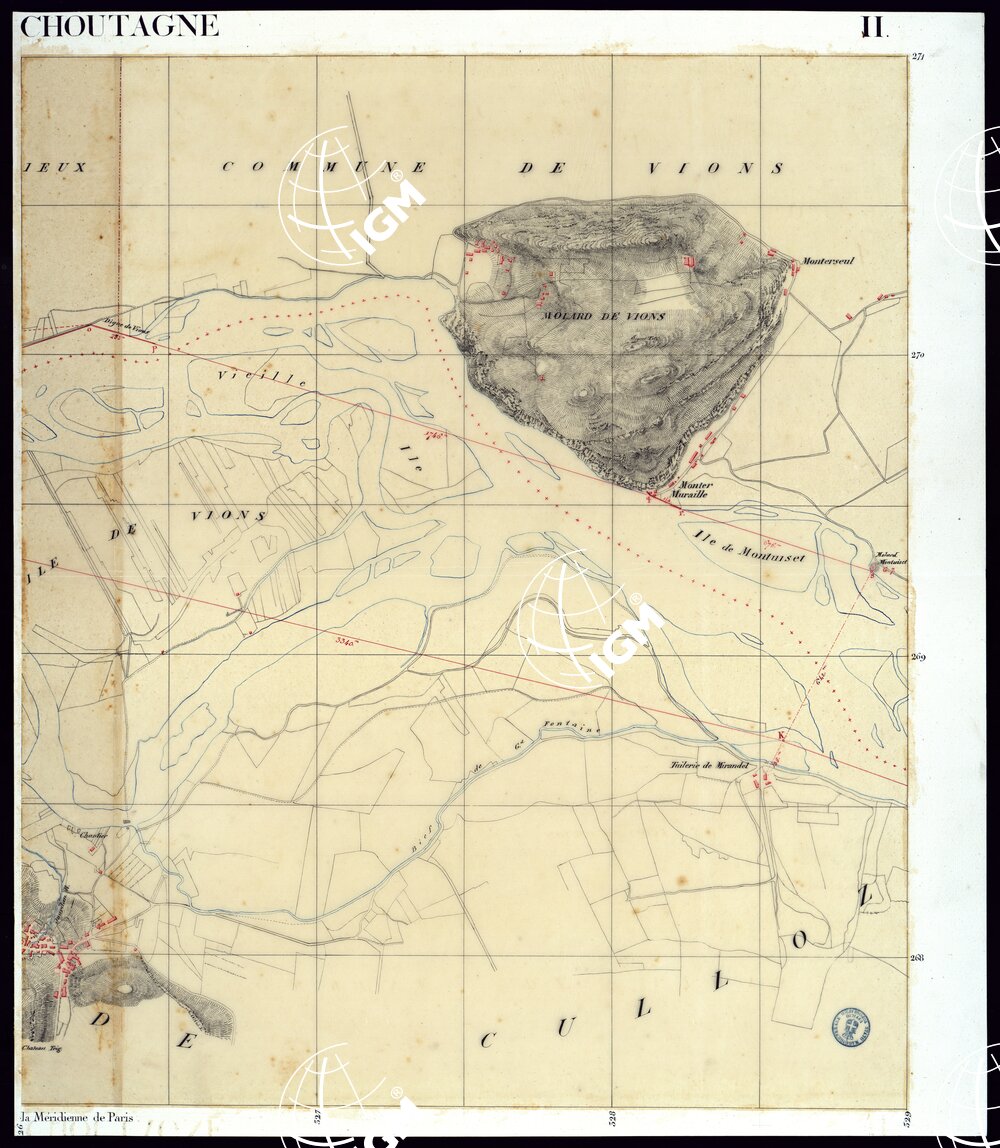 Disegno a penna su carta lucida, probabilmente copia di un disegno originale. La carta si compone di 21 fogli (dei quali i primi 4 in due parti) ed un quadro d’unione per cui complessivamente consta di 26 grandi fogli non totalmente riempiti. E’ riprodotto il corso del Rodano da un punto a circa 2 km. a monte di Anglefort sino alla confluenza del Guiers ed il corso di quest’ultimo sino al Pont Saint Martin poco a monte di Les Echelles. Il disegno è in azzurro per le acque, in rosso per i fabbricati, le dighe, il confine e le misure di riferimento; in nero per la rete stradale, il tratteggio orografico e le scritture. Il Quadro d’Unione alla scala di 1:100.000 porta in calce un elenco di 42 posizioni determinate per le loro coordinate rettangolari riferite alla meridiana ed alla perpendicolare di Parigi in base alle quali è tracciato il reticolato cassiniano della Carta. Documento interessante per la topografia storica dei fiumi rappresentati.