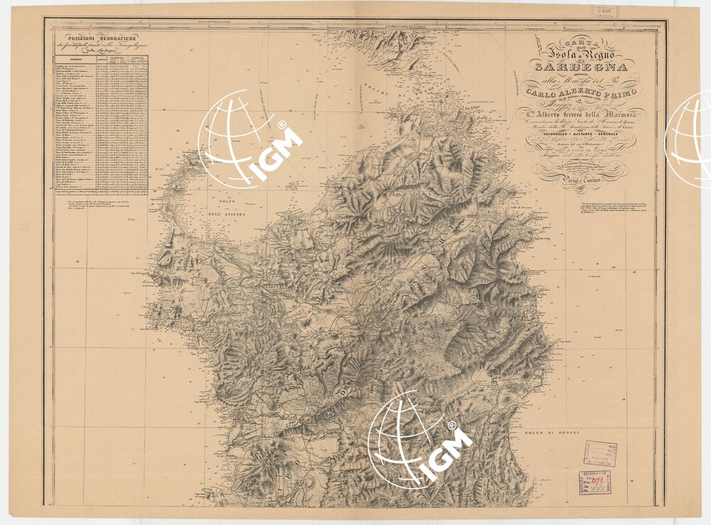 Dedicata alla Maestà del Re Carlo Alberto Primo dal suo umilissimo e devotissimo suddito il Maggior Generale C.te Alberto Ferrero della Marmora, Comandante la Regia scuola di marina di Genova, Membro della R. Accademia delle Scienze di Torino; già Colonnello -ajutante -Generale nel R. Corpo di Stato Maggiore Generale, assistito dal suo collaboratore * il cav. D. Carlo de Candia Maggiore nel R. Corpo suddetto. Incisa da Debuissons, Strada des bernardins, 24. Scritta da Arnoul impiegato al deposito della Guerra, addetto alla Carta di Francia_ Ibid. Paris e Torino, 1845.