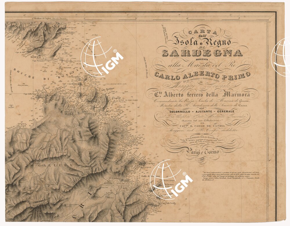 Dedicata alla Maestà del Re Carlo Alberto Primo dal suo umilissimo e devotissimo suddito il Maggior Generale C.te Alberto Ferrero della Marmora, Comandante la Regia scuola di marina di Genova, Membro della R. Accademia delle Scienze di Torino; già Colonnello -ajutante -Generale nel R. Corpo di Stato Maggiore Generale, assistito dal suo collaboratore * il cav. D. Carlo de Candia Maggiore nel R. Corpo suddetto. Incisa da Debuissons, Strada des bernardins, 24. Scritta da Arnoul impiegato al deposito della Guerra, addetto alla Carta di Francia_ Ibid. Paris e Torino, 1845.