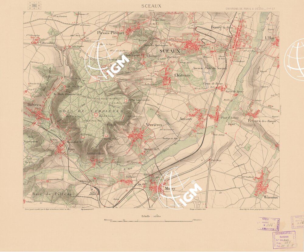 Paris. – Dèpot de la Guerre, 1881. Ha servito di base per la compilazione di questa carta, quella del Dipartimento della Senna al 40.000 incisa su rame. Si compone di 36 fogli stampati da incisione su zinco. Fu iniziata nel luglio 1879 e terminata nel 1881. E’ a sei colori e cioè: nero per le vie di comunicazione, limiti amministrativi e scritture, bleu per l’idrografia, rosso per le costruzioni, verde per i boschi, bistro per le curve di livello con equidistanza di cm. 5 e bruno scuro per lo sfumo a luce zenitale modellante il rilievo. La carta è aggiornata fino al 1887. Di essa esiste una edizione in nero con orografia a tratteggio.