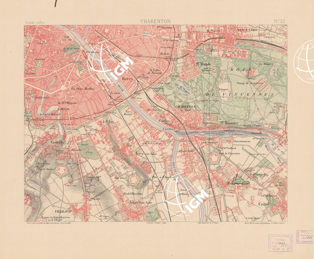 Paris. – Dèpot de la Guerre, 1881. Ha servito di base per la compilazione di questa carta, quella del Dipartimento della Senna al 40.000 incisa su rame. Si compone di 36 fogli stampati da incisione su zinco. Fu iniziata nel luglio 1879 e terminata nel 1881. E’ a sei colori e cioè: nero per le vie di comunicazione, limiti amministrativi e scritture, bleu per l’idrografia, rosso per le costruzioni, verde per i boschi, bistro per le curve di livello con equidistanza di cm. 5 e bruno scuro per lo sfumo a luce zenitale modellante il rilievo. La carta è aggiornata fino al 1887. Di essa esiste una edizione in nero con orografia a tratteggio.