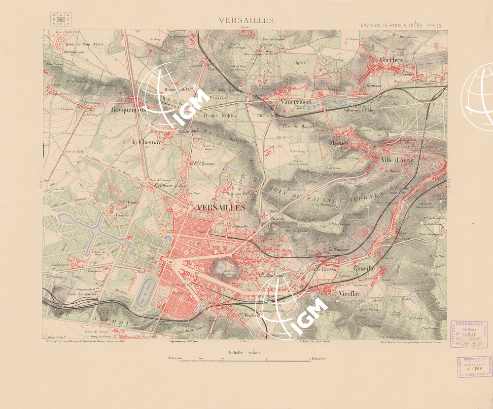 Paris. – Dèpot de la Guerre, 1881. Ha servito di base per la compilazione di questa carta, quella del Dipartimento della Senna al 40.000 incisa su rame. Si compone di 36 fogli stampati da incisione su zinco. Fu iniziata nel luglio 1879 e terminata nel 1881. E’ a sei colori e cioè: nero per le vie di comunicazione, limiti amministrativi e scritture, bleu per l’idrografia, rosso per le costruzioni, verde per i boschi, bistro per le curve di livello con equidistanza di cm. 5 e bruno scuro per lo sfumo a luce zenitale modellante il rilievo. La carta è aggiornata fino al 1887. Di essa esiste una edizione in nero con orografia a tratteggio.