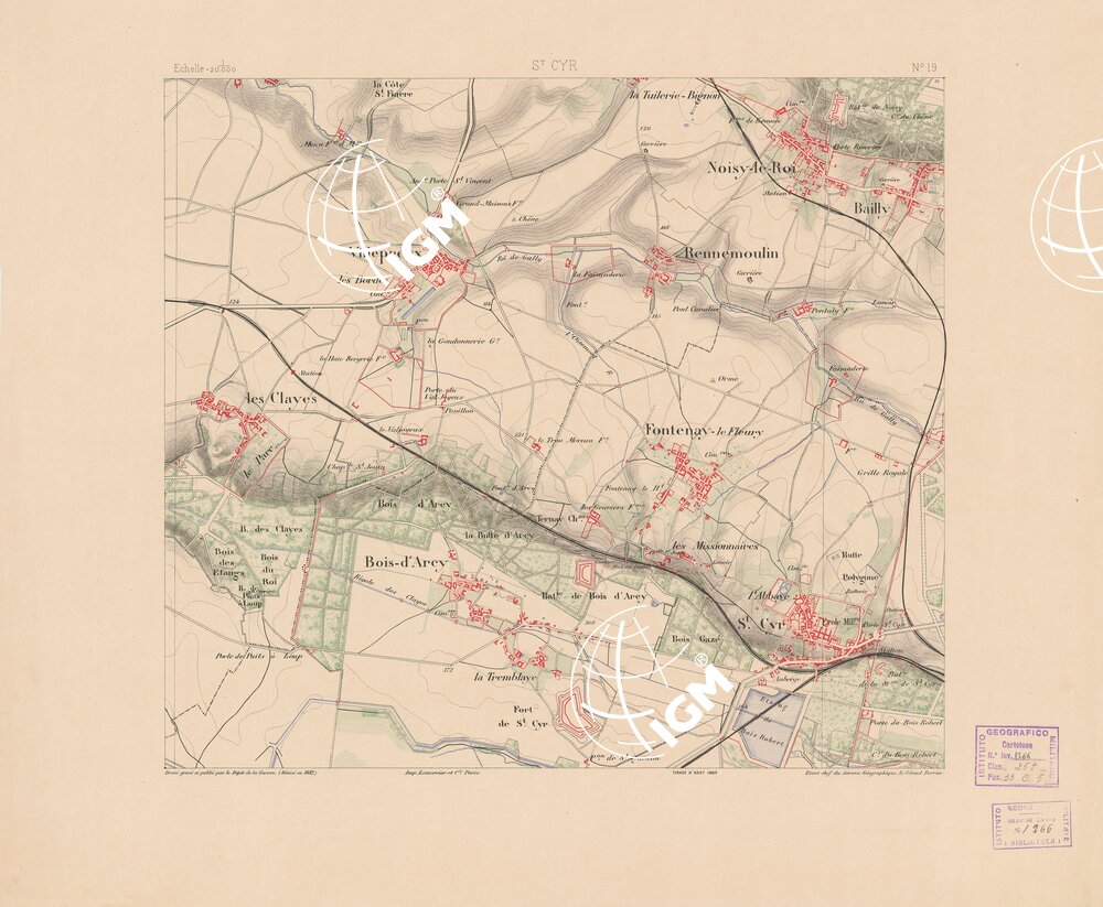 Paris. – Dèpot de la Guerre, 1881. Ha servito di base per la compilazione di questa carta, quella del Dipartimento della Senna al 40.000 incisa su rame. Si compone di 36 fogli stampati da incisione su zinco. Fu iniziata nel luglio 1879 e terminata nel 1881. E’ a sei colori e cioè: nero per le vie di comunicazione, limiti amministrativi e scritture, bleu per l’idrografia, rosso per le costruzioni, verde per i boschi, bistro per le curve di livello con equidistanza di cm. 5 e bruno scuro per lo sfumo a luce zenitale modellante il rilievo. La carta è aggiornata fino al 1887. Di essa esiste una edizione in nero con orografia a tratteggio.