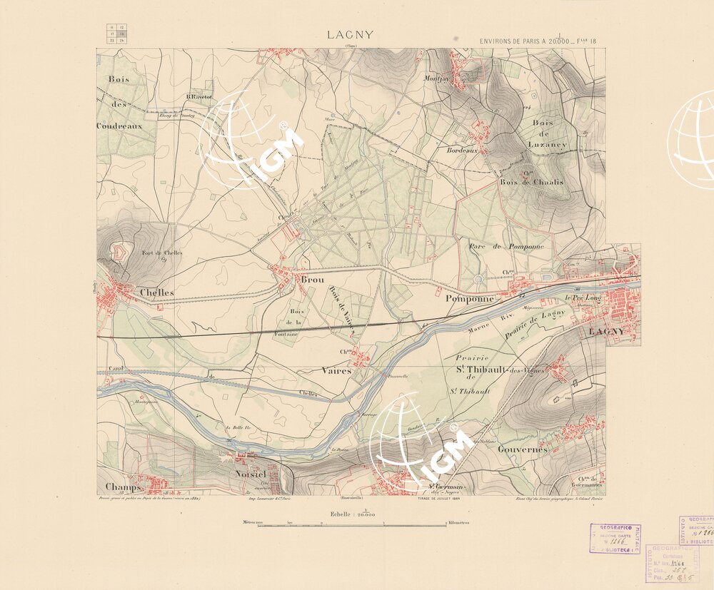 Paris. – Dèpot de la Guerre, 1881. Ha servito di base per la compilazione di questa carta, quella del Dipartimento della Senna al 40.000 incisa su rame. Si compone di 36 fogli stampati da incisione su zinco. Fu iniziata nel luglio 1879 e terminata nel 1881. E’ a sei colori e cioè: nero per le vie di comunicazione, limiti amministrativi e scritture, bleu per l’idrografia, rosso per le costruzioni, verde per i boschi, bistro per le curve di livello con equidistanza di cm. 5 e bruno scuro per lo sfumo a luce zenitale modellante il rilievo. La carta è aggiornata fino al 1887. Di essa esiste una edizione in nero con orografia a tratteggio.