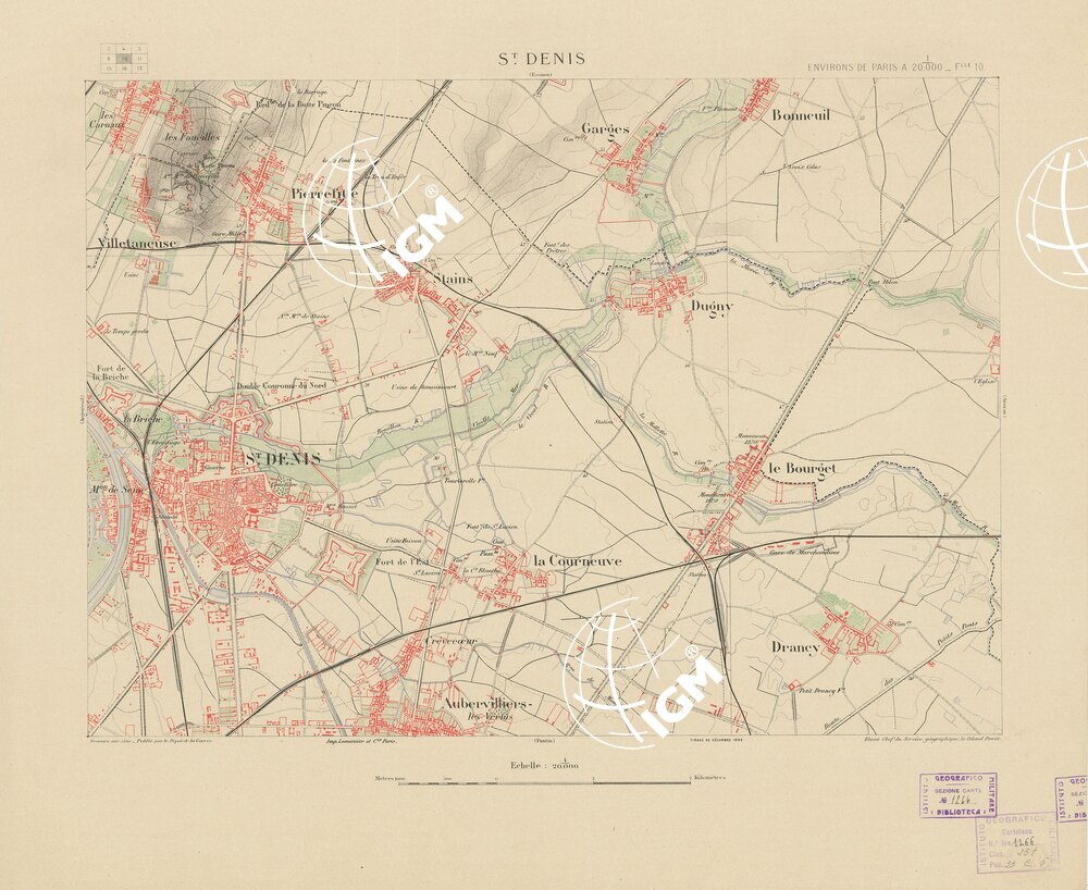 Paris. – Dèpot de la Guerre, 1881. Ha servito di base per la compilazione di questa carta, quella del Dipartimento della Senna al 40.000 incisa su rame. Si compone di 36 fogli stampati da incisione su zinco. Fu iniziata nel luglio 1879 e terminata nel 1881. E’ a sei colori e cioè: nero per le vie di comunicazione, limiti amministrativi e scritture, bleu per l’idrografia, rosso per le costruzioni, verde per i boschi, bistro per le curve di livello con equidistanza di cm. 5 e bruno scuro per lo sfumo a luce zenitale modellante il rilievo. La carta è aggiornata fino al 1887. Di essa esiste una edizione in nero con orografia a tratteggio.