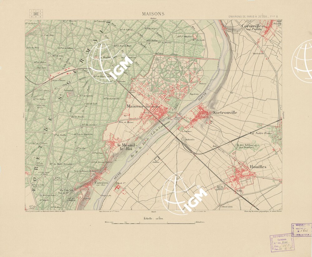 Paris. – Dèpot de la Guerre, 1881. Ha servito di base per la compilazione di questa carta, quella del Dipartimento della Senna al 40.000 incisa su rame. Si compone di 36 fogli stampati da incisione su zinco. Fu iniziata nel luglio 1879 e terminata nel 1881. E’ a sei colori e cioè: nero per le vie di comunicazione, limiti amministrativi e scritture, bleu per l’idrografia, rosso per le costruzioni, verde per i boschi, bistro per le curve di livello con equidistanza di cm. 5 e bruno scuro per lo sfumo a luce zenitale modellante il rilievo. La carta è aggiornata fino al 1887. Di essa esiste una edizione in nero con orografia a tratteggio.