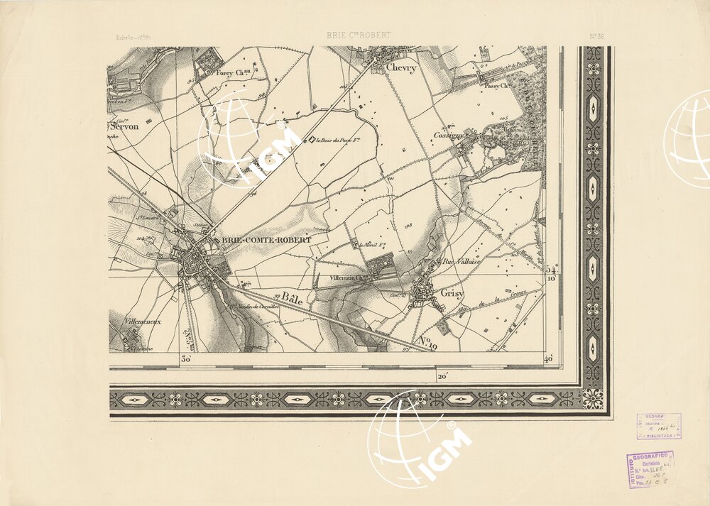 Paris. – Dèpot de la Guerre, 1881. Ha servito di base per la compilazione di questa carta, quella del Dipartimento della Senna al 40.000 incisa su rame. Si compone di 36 fogli stampati da incisione su zinco. Fu iniziata nel luglio 1879 e terminata nel 1881. E’ a sei colori e cioè: nero per le vie di comunicazione, limiti amministrativi e scritture, bleu per l’idrografia, rosso per le costruzioni, verde per i boschi, bistro per le curve di livello con equidistanza di cm. 5 e bruno scuro per lo sfumo a luce zenitale modellante il rilievo. La carta è aggiornata fino al 1887. Di essa esiste una edizione in nero con orografia a tratteggio.