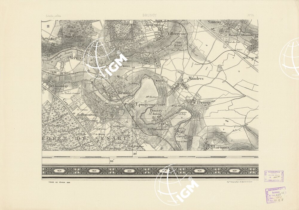 Paris. – Dèpot de la Guerre, 1881. Ha servito di base per la compilazione di questa carta, quella del Dipartimento della Senna al 40.000 incisa su rame. Si compone di 36 fogli stampati da incisione su zinco. Fu iniziata nel luglio 1879 e terminata nel 1881. E’ a sei colori e cioè: nero per le vie di comunicazione, limiti amministrativi e scritture, bleu per l’idrografia, rosso per le costruzioni, verde per i boschi, bistro per le curve di livello con equidistanza di cm. 5 e bruno scuro per lo sfumo a luce zenitale modellante il rilievo. La carta è aggiornata fino al 1887. Di essa esiste una edizione in nero con orografia a tratteggio.