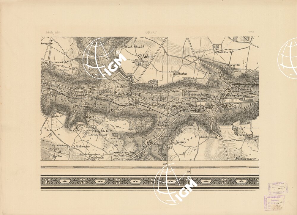 Paris. – Dèpot de la Guerre, 1881. Ha servito di base per la compilazione di questa carta, quella del Dipartimento della Senna al 40.000 incisa su rame. Si compone di 36 fogli stampati da incisione su zinco. Fu iniziata nel luglio 1879 e terminata nel 1881. E’ a sei colori e cioè: nero per le vie di comunicazione, limiti amministrativi e scritture, bleu per l’idrografia, rosso per le costruzioni, verde per i boschi, bistro per le curve di livello con equidistanza di cm. 5 e bruno scuro per lo sfumo a luce zenitale modellante il rilievo. La carta è aggiornata fino al 1887. Di essa esiste una edizione in nero con orografia a tratteggio.
