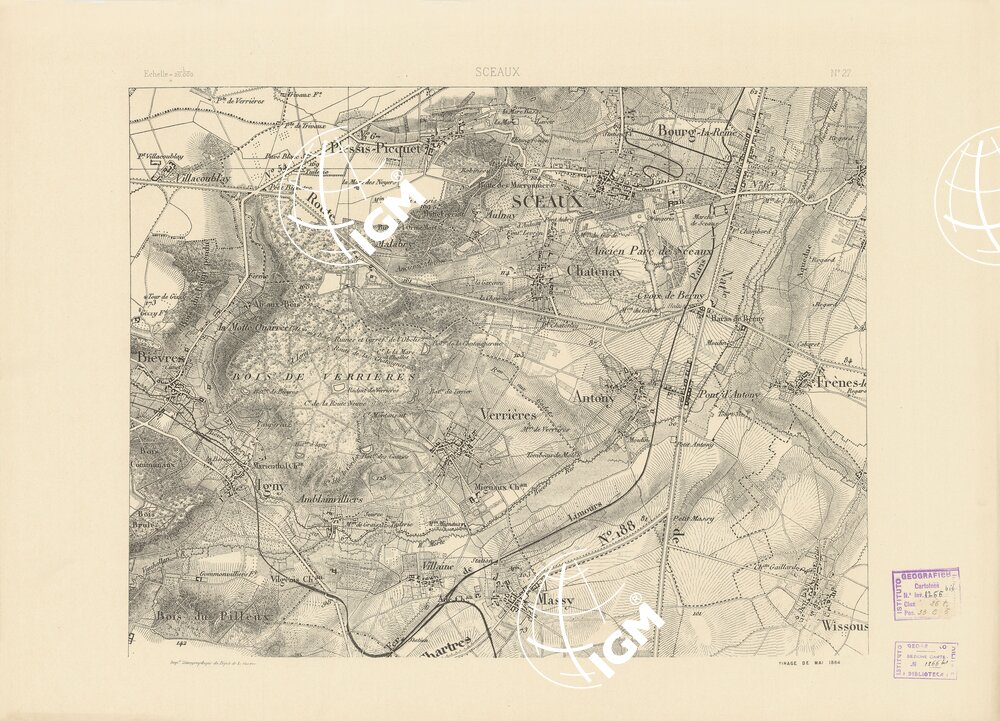Paris. – Dèpot de la Guerre, 1881. Ha servito di base per la compilazione di questa carta, quella del Dipartimento della Senna al 40.000 incisa su rame. Si compone di 36 fogli stampati da incisione su zinco. Fu iniziata nel luglio 1879 e terminata nel 1881. E’ a sei colori e cioè: nero per le vie di comunicazione, limiti amministrativi e scritture, bleu per l’idrografia, rosso per le costruzioni, verde per i boschi, bistro per le curve di livello con equidistanza di cm. 5 e bruno scuro per lo sfumo a luce zenitale modellante il rilievo. La carta è aggiornata fino al 1887. Di essa esiste una edizione in nero con orografia a tratteggio.