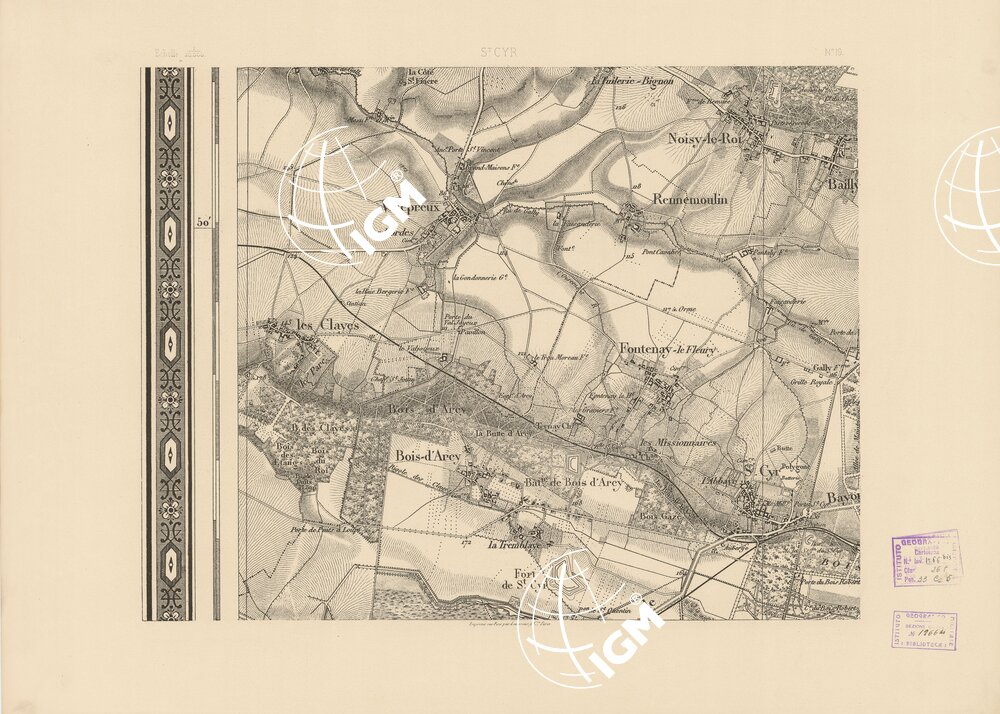 Paris. – Dèpot de la Guerre, 1881. Ha servito di base per la compilazione di questa carta, quella del Dipartimento della Senna al 40.000 incisa su rame. Si compone di 36 fogli stampati da incisione su zinco. Fu iniziata nel luglio 1879 e terminata nel 1881. E’ a sei colori e cioè: nero per le vie di comunicazione, limiti amministrativi e scritture, bleu per l’idrografia, rosso per le costruzioni, verde per i boschi, bistro per le curve di livello con equidistanza di cm. 5 e bruno scuro per lo sfumo a luce zenitale modellante il rilievo. La carta è aggiornata fino al 1887. Di essa esiste una edizione in nero con orografia a tratteggio.