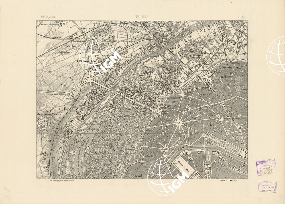 Paris. – Dèpot de la Guerre, 1881. Ha servito di base per la compilazione di questa carta, quella del Dipartimento della Senna al 40.000 incisa su rame. Si compone di 36 fogli stampati da incisione su zinco. Fu iniziata nel luglio 1879 e terminata nel 1881. E’ a sei colori e cioè: nero per le vie di comunicazione, limiti amministrativi e scritture, bleu per l’idrografia, rosso per le costruzioni, verde per i boschi, bistro per le curve di livello con equidistanza di cm. 5 e bruno scuro per lo sfumo a luce zenitale modellante il rilievo. La carta è aggiornata fino al 1887. Di essa esiste una edizione in nero con orografia a tratteggio.