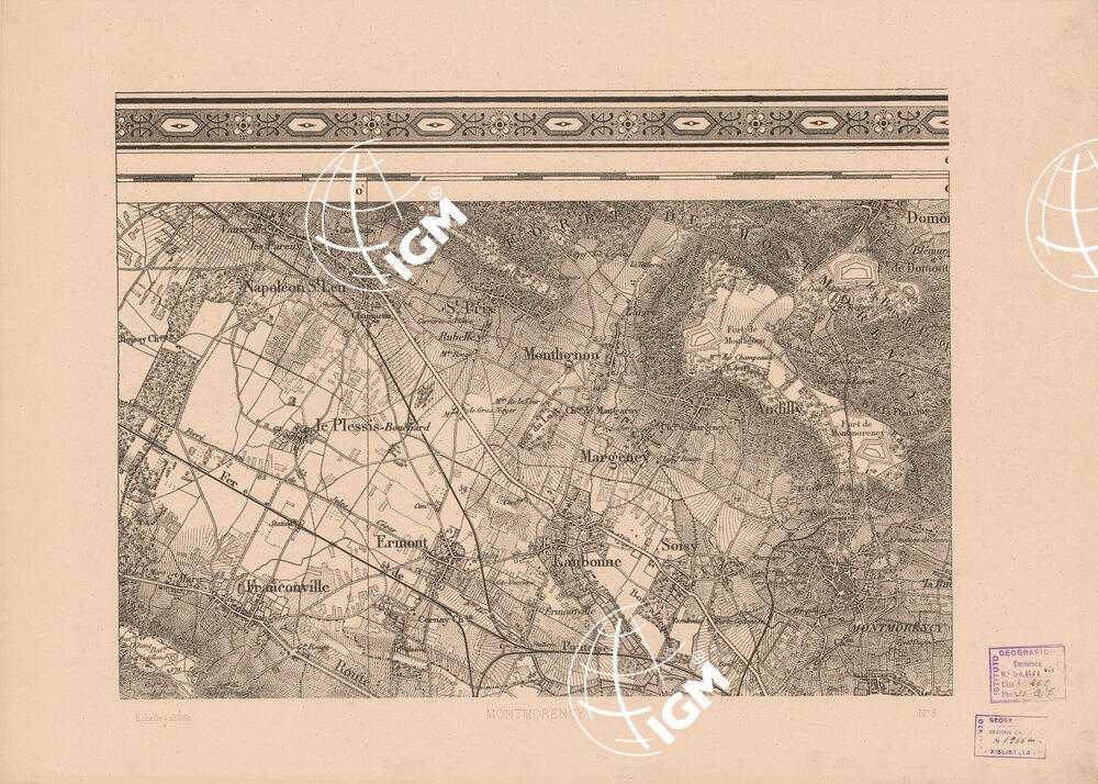 Paris. – Dèpot de la Guerre, 1881. Ha servito di base per la compilazione di questa carta, quella del Dipartimento della Senna al 40.000 incisa su rame. Si compone di 36 fogli stampati da incisione su zinco. Fu iniziata nel luglio 1879 e terminata nel 1881. E’ a sei colori e cioè: nero per le vie di comunicazione, limiti amministrativi e scritture, bleu per l’idrografia, rosso per le costruzioni, verde per i boschi, bistro per le curve di livello con equidistanza di cm. 5 e bruno scuro per lo sfumo a luce zenitale modellante il rilievo. La carta è aggiornata fino al 1887. Di essa esiste una edizione in nero con orografia a tratteggio.