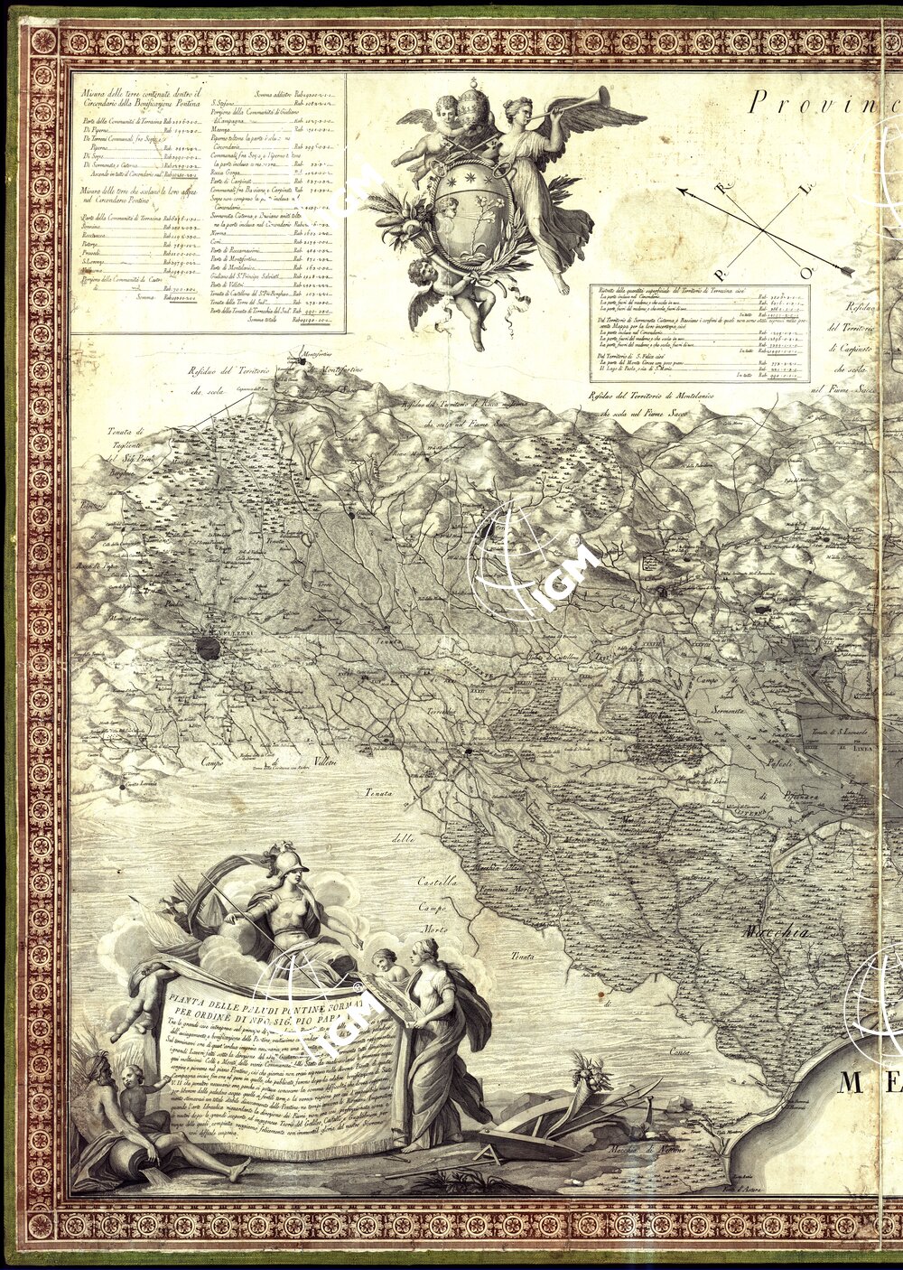 Bella, interessante carta incisa su rame in due fogli. Rilievo e disegno di Gaetano Astolfi. Incisore Carlo Antonini della Calcografia Cameraole. La carta si riferisce ai lavori idraulici compiuti dall’Ing. G. Rappini per la bonifica delle Paludi. Orientazione: il nord è spostato a sinistra. Orografia prospettica. Il foglio sud-occidentale contiene la dedica a Papa Pio VI sotto il cui pontificato si compirono tale lavori; il foglio nord occidentale reca i dati relativi alla superficie dei terreni; il foglio sud orientale la leggenda dei segni convenzionali circa lo stato di sommersione dei terreni quale riscontrata durante l’ispezione e la scala geografica in canne. Alla carta sono annesse sei tavole con vedute, incisioni di Fr. de Capo e C. Antonini. Una delle tavole contiene la pianta del Porto di Terracina. Due copie, una delle quali in fogli riuniti in quadro unico e montati su tela. Cfr. Arrigoni e Bertarelli. Le carte geografiche dell’Italia, ecc. N°2149 L’altra copia su quattro fogli è alla collezione Camerale n.576