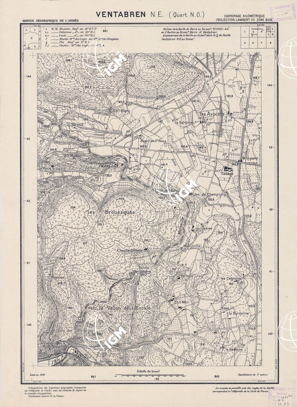 Paris. – Service Géographique de l'Arme 1914-1918. – Questi piani sono stati allestiti durante la guerra mondiale da i "Groupes de Canevas de Tir aux Armées". Su di essi venivano riportate le sistemazioni difensive amiche e nemiche e le varie opere militari. Nelle regioni in cui esistevano le carte alla scala 1:10.000, provenienti da rilievi diretti, queste costituivano la base dei plans directeurs, mentre altrove essi erano dedotti dai piani catastali al 10.000 inquadrati nelle reti dei punti trigonometrici, introducendo per la rappresentazione dell'orografia le linee di livello ricavate dall'ingrandimento dei rilevamenti alla scala 1:40.000. Poichè con tale sistema non si aveva una esatta rappresentazione del terreno, a cura dei "Groupes de Canevas de Tir" fu provveduto, in molte zone, all'esecuzione dei rilievi regolari alla scala 1:10.000. Di tali piani esistono diverse edizioni con formato variabile: una edizione in nero con orografia rappresentata a curve di livello all'equidistanza di m.5 con quadrettatura chilometrica-sistema Lambert; altre edizioni: in nero con curve di livello in bistro, e policrome, sono senza quadrettatura.