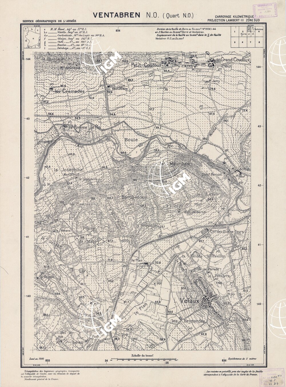 Paris. – Service Géographique de l’Arme 1914-1918. – Questi piani sono stati allestiti durante la guerra mondiale da i “Groupes de Canevas de Tir aux Armées”. Su di essi venivano riportate le sistemazioni difensive amiche e nemiche e le varie opere militari. Nelle regioni in cui esistevano le carte alla scala 1:10.000, provenienti da rilievi diretti, queste costituivano la base dei plans directeurs, mentre altrove essi erano dedotti dai piani catastali al 10.000 inquadrati nelle reti dei punti trigonometrici, introducendo per la rappresentazione dell’orografia le linee di livello ricavate dall’ingrandimento dei rilevamenti alla scala 1:40.000. Poichè con tale sistema non si aveva una esatta rappresentazione del terreno, a cura dei “Groupes de Canevas de Tir” fu provveduto, in molte zone, all’esecuzione dei rilievi regolari alla scala 1:10.000. Di tali piani esistono diverse edizioni con formato variabile: una edizione in nero con orografia rappresentata a curve di livello all’equidistanza di m.5 con quadrettatura chilometrica-sistema Lambert; altre edizioni: in nero con curve di livello in bistro, e policrome, sono senza quadrettatura.