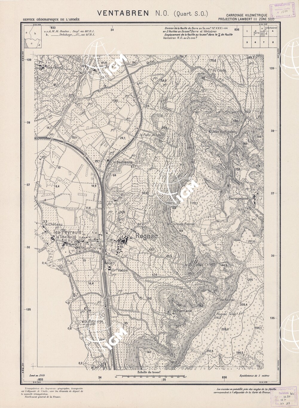 Paris. – Service Géographique de l’Arme 1914-1918. – Questi piani sono stati allestiti durante la guerra mondiale da i “Groupes de Canevas de Tir aux Armées”. Su di essi venivano riportate le sistemazioni difensive amiche e nemiche e le varie opere militari. Nelle regioni in cui esistevano le carte alla scala 1:10.000, provenienti da rilievi diretti, queste costituivano la base dei plans directeurs, mentre altrove essi erano dedotti dai piani catastali al 10.000 inquadrati nelle reti dei punti trigonometrici, introducendo per la rappresentazione dell’orografia le linee di livello ricavate dall’ingrandimento dei rilevamenti alla scala 1:40.000. Poichè con tale sistema non si aveva una esatta rappresentazione del terreno, a cura dei “Groupes de Canevas de Tir” fu provveduto, in molte zone, all’esecuzione dei rilievi regolari alla scala 1:10.000. Di tali piani esistono diverse edizioni con formato variabile: una edizione in nero con orografia rappresentata a curve di livello all’equidistanza di m.5 con quadrettatura chilometrica-sistema Lambert; altre edizioni: in nero con curve di livello in bistro, e policrome, sono senza quadrettatura.