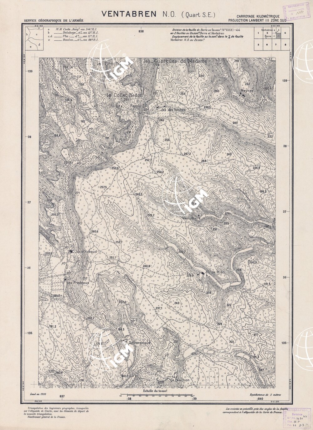 Paris. – Service Géographique de l'Arme 1914-1918. – Questi piani sono stati allestiti durante la guerra mondiale da i "Groupes de Canevas de Tir aux Armées". Su di essi venivano riportate le sistemazioni difensive amiche e nemiche e le varie opere militari. Nelle regioni in cui esistevano le carte alla scala 1:10.000, provenienti da rilievi diretti, queste costituivano la base dei plans directeurs, mentre altrove essi erano dedotti dai piani catastali al 10.000 inquadrati nelle reti dei punti trigonometrici, introducendo per la rappresentazione dell'orografia le linee di livello ricavate dall'ingrandimento dei rilevamenti alla scala 1:40.000. Poichè con tale sistema non si aveva una esatta rappresentazione del terreno, a cura dei "Groupes de Canevas de Tir" fu provveduto, in molte zone, all'esecuzione dei rilievi regolari alla scala 1:10.000. Di tali piani esistono diverse edizioni con formato variabile: una edizione in nero con orografia rappresentata a curve di livello all'equidistanza di m.5 con quadrettatura chilometrica-sistema Lambert; altre edizioni: in nero con curve di livello in bistro, e policrome, sono senza quadrettatura.