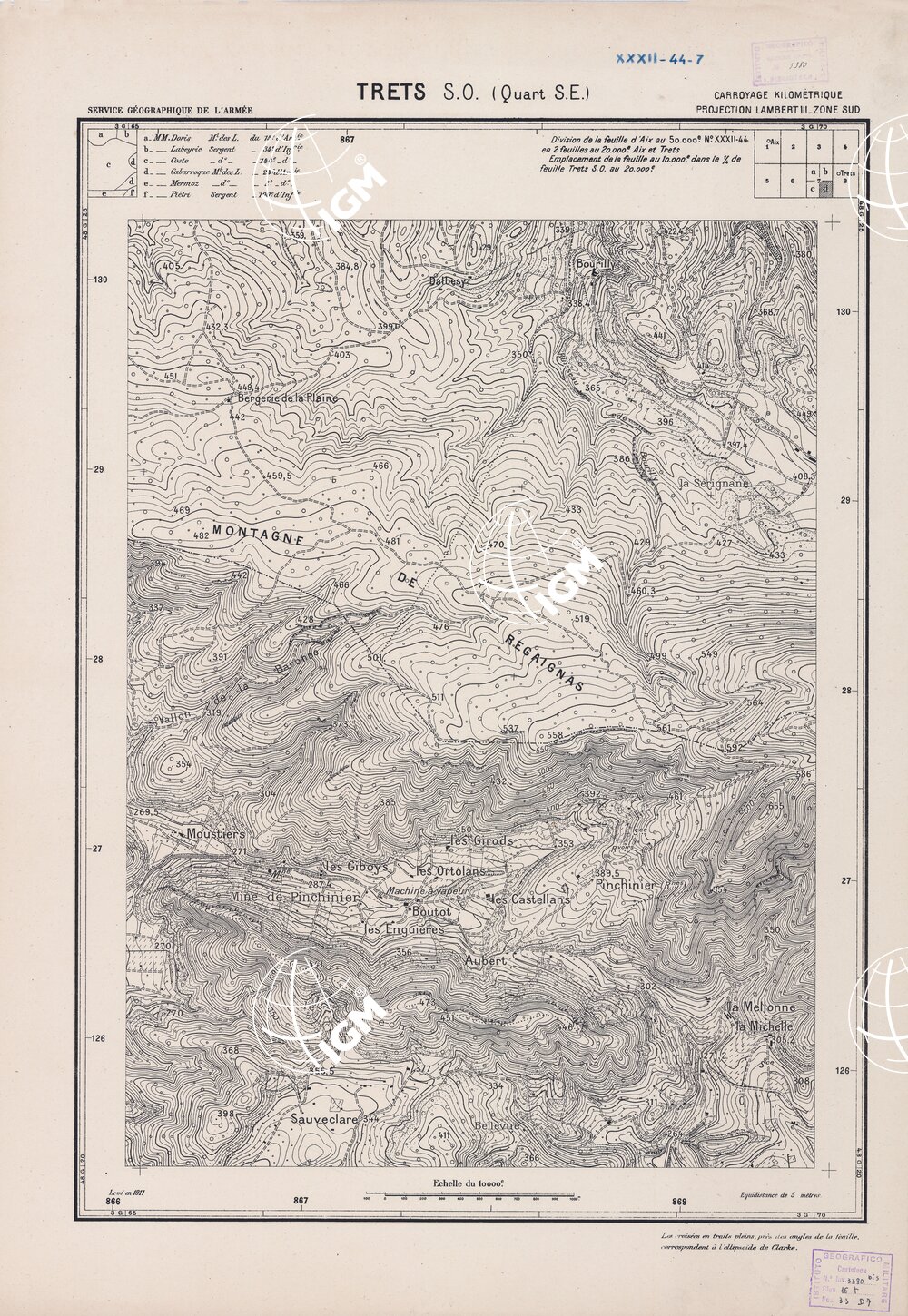Paris. – Service Géographique de l'Arme 1914-1918. – Questi piani sono stati allestiti durante la guerra mondiale da i "Groupes de Canevas de Tir aux Armées". Su di essi venivano riportate le sistemazioni difensive amiche e nemiche e le varie opere militari. Nelle regioni in cui esistevano le carte alla scala 1:10.000, provenienti da rilievi diretti, queste costituivano la base dei plans directeurs, mentre altrove essi erano dedotti dai piani catastali al 10.000 inquadrati nelle reti dei punti trigonometrici, introducendo per la rappresentazione dell'orografia le linee di livello ricavate dall'ingrandimento dei rilevamenti alla scala 1:40.000. Poichè con tale sistema non si aveva una esatta rappresentazione del terreno, a cura dei "Groupes de Canevas de Tir" fu provveduto, in molte zone, all'esecuzione dei rilievi regolari alla scala 1:10.000. Di tali piani esistono diverse edizioni con formato variabile: una edizione in nero con orografia rappresentata a curve di livello all'equidistanza di m.5 con quadrettatura chilometrica-sistema Lambert; altre edizioni: in nero con curve di livello in bistro, e policrome, sono senza quadrettatura.