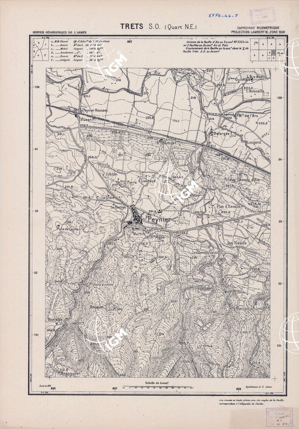 Paris. – Service Géographique de l'Arme 1914-1918. – Questi piani sono stati allestiti durante la guerra mondiale da i "Groupes de Canevas de Tir aux Armées". Su di essi venivano riportate le sistemazioni difensive amiche e nemiche e le varie opere militari. Nelle regioni in cui esistevano le carte alla scala 1:10.000, provenienti da rilievi diretti, queste costituivano la base dei plans directeurs, mentre altrove essi erano dedotti dai piani catastali al 10.000 inquadrati nelle reti dei punti trigonometrici, introducendo per la rappresentazione dell'orografia le linee di livello ricavate dall'ingrandimento dei rilevamenti alla scala 1:40.000. Poichè con tale sistema non si aveva una esatta rappresentazione del terreno, a cura dei "Groupes de Canevas de Tir" fu provveduto, in molte zone, all'esecuzione dei rilievi regolari alla scala 1:10.000. Di tali piani esistono diverse edizioni con formato variabile: una edizione in nero con orografia rappresentata a curve di livello all'equidistanza di m.5 con quadrettatura chilometrica-sistema Lambert; altre edizioni: in nero con curve di livello in bistro, e policrome, sono senza quadrettatura.