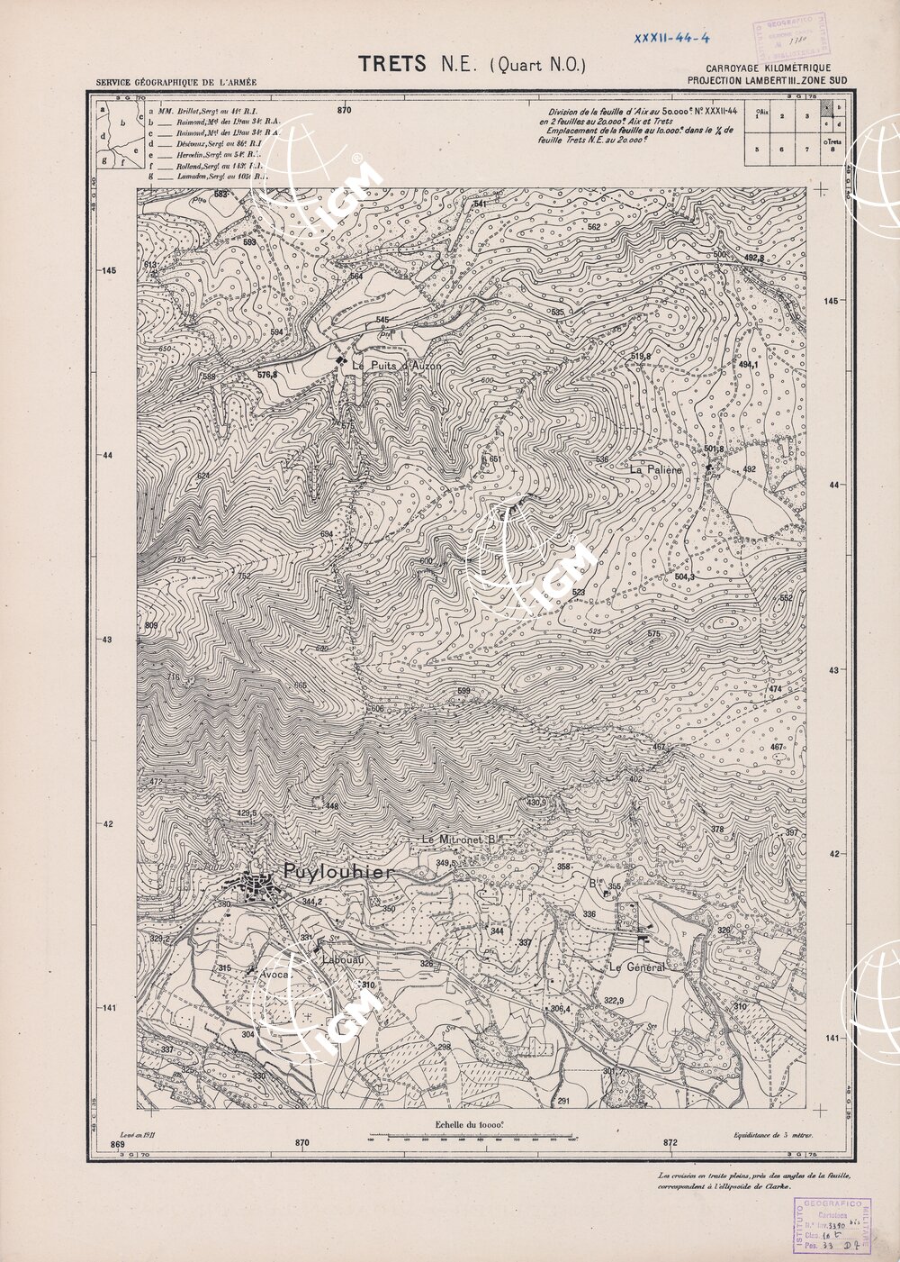 Paris. – Service Géographique de l'Arme 1914-1918. – Questi piani sono stati allestiti durante la guerra mondiale da i "Groupes de Canevas de Tir aux Armées". Su di essi venivano riportate le sistemazioni difensive amiche e nemiche e le varie opere militari. Nelle regioni in cui esistevano le carte alla scala 1:10.000, provenienti da rilievi diretti, queste costituivano la base dei plans directeurs, mentre altrove essi erano dedotti dai piani catastali al 10.000 inquadrati nelle reti dei punti trigonometrici, introducendo per la rappresentazione dell'orografia le linee di livello ricavate dall'ingrandimento dei rilevamenti alla scala 1:40.000. Poichè con tale sistema non si aveva una esatta rappresentazione del terreno, a cura dei "Groupes de Canevas de Tir" fu provveduto, in molte zone, all'esecuzione dei rilievi regolari alla scala 1:10.000. Di tali piani esistono diverse edizioni con formato variabile: una edizione in nero con orografia rappresentata a curve di livello all'equidistanza di m.5 con quadrettatura chilometrica-sistema Lambert; altre edizioni: in nero con curve di livello in bistro, e policrome, sono senza quadrettatura.