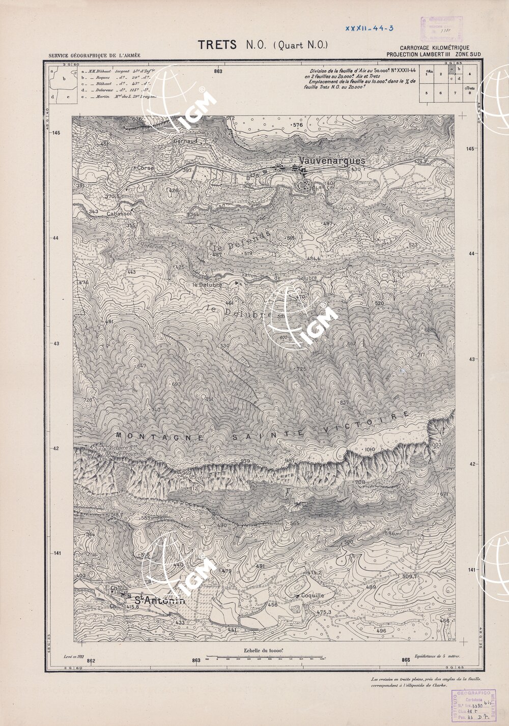 Paris. – Service Géographique de l'Arme 1914-1918. – Questi piani sono stati allestiti durante la guerra mondiale da i "Groupes de Canevas de Tir aux Armées". Su di essi venivano riportate le sistemazioni difensive amiche e nemiche e le varie opere militari. Nelle regioni in cui esistevano le carte alla scala 1:10.000, provenienti da rilievi diretti, queste costituivano la base dei plans directeurs, mentre altrove essi erano dedotti dai piani catastali al 10.000 inquadrati nelle reti dei punti trigonometrici, introducendo per la rappresentazione dell'orografia le linee di livello ricavate dall'ingrandimento dei rilevamenti alla scala 1:40.000. Poichè con tale sistema non si aveva una esatta rappresentazione del terreno, a cura dei "Groupes de Canevas de Tir" fu provveduto, in molte zone, all'esecuzione dei rilievi regolari alla scala 1:10.000. Di tali piani esistono diverse edizioni con formato variabile: una edizione in nero con orografia rappresentata a curve di livello all'equidistanza di m.5 con quadrettatura chilometrica-sistema Lambert; altre edizioni: in nero con curve di livello in bistro, e policrome, sono senza quadrettatura.