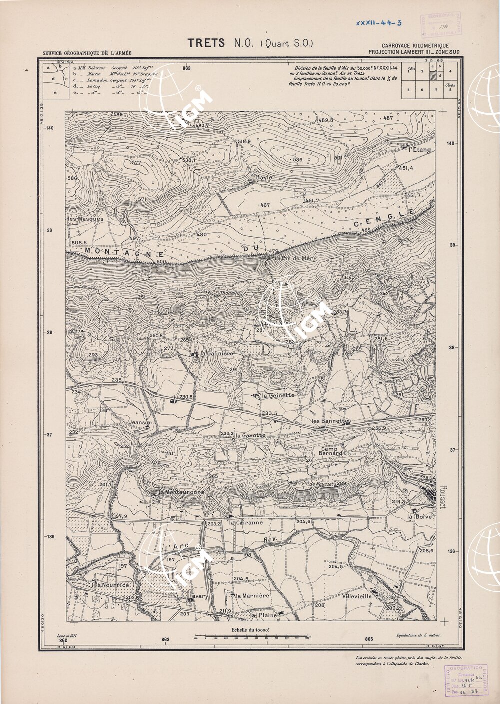 Paris. – Service Géographique de l'Arme 1914-1918. – Questi piani sono stati allestiti durante la guerra mondiale da i "Groupes de Canevas de Tir aux Armées". Su di essi venivano riportate le sistemazioni difensive amiche e nemiche e le varie opere militari. Nelle regioni in cui esistevano le carte alla scala 1:10.000, provenienti da rilievi diretti, queste costituivano la base dei plans directeurs, mentre altrove essi erano dedotti dai piani catastali al 10.000 inquadrati nelle reti dei punti trigonometrici, introducendo per la rappresentazione dell'orografia le linee di livello ricavate dall'ingrandimento dei rilevamenti alla scala 1:40.000. Poichè con tale sistema non si aveva una esatta rappresentazione del terreno, a cura dei "Groupes de Canevas de Tir" fu provveduto, in molte zone, all'esecuzione dei rilievi regolari alla scala 1:10.000. Di tali piani esistono diverse edizioni con formato variabile: una edizione in nero con orografia rappresentata a curve di livello all'equidistanza di m.5 con quadrettatura chilometrica-sistema Lambert; altre edizioni: in nero con curve di livello in bistro, e policrome, sono senza quadrettatura.