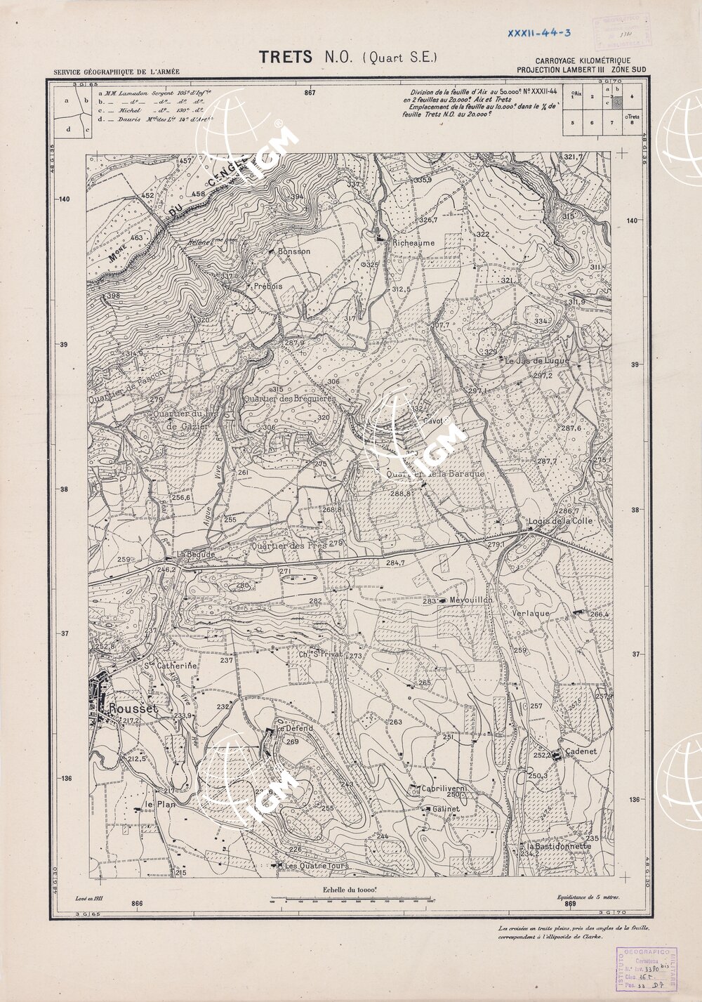 Paris. – Service Géographique de l'Arme 1914-1918. – Questi piani sono stati allestiti durante la guerra mondiale da i "Groupes de Canevas de Tir aux Armées". Su di essi venivano riportate le sistemazioni difensive amiche e nemiche e le varie opere militari. Nelle regioni in cui esistevano le carte alla scala 1:10.000, provenienti da rilievi diretti, queste costituivano la base dei plans directeurs, mentre altrove essi erano dedotti dai piani catastali al 10.000 inquadrati nelle reti dei punti trigonometrici, introducendo per la rappresentazione dell'orografia le linee di livello ricavate dall'ingrandimento dei rilevamenti alla scala 1:40.000. Poichè con tale sistema non si aveva una esatta rappresentazione del terreno, a cura dei "Groupes de Canevas de Tir" fu provveduto, in molte zone, all'esecuzione dei rilievi regolari alla scala 1:10.000. Di tali piani esistono diverse edizioni con formato variabile: una edizione in nero con orografia rappresentata a curve di livello all'equidistanza di m.5 con quadrettatura chilometrica-sistema Lambert; altre edizioni: in nero con curve di livello in bistro, e policrome, sono senza quadrettatura.