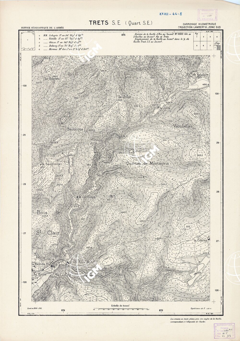 Paris. – Service Géographique de l'Arme 1914-1918. – Questi piani sono stati allestiti durante la guerra mondiale da i "Groupes de Canevas de Tir aux Armées". Su di essi venivano riportate le sistemazioni difensive amiche e nemiche e le varie opere militari. Nelle regioni in cui esistevano le carte alla scala 1:10.000, provenienti da rilievi diretti, queste costituivano la base dei plans directeurs, mentre altrove essi erano dedotti dai piani catastali al 10.000 inquadrati nelle reti dei punti trigonometrici, introducendo per la rappresentazione dell'orografia le linee di livello ricavate dall'ingrandimento dei rilevamenti alla scala 1:40.000. Poichè con tale sistema non si aveva una esatta rappresentazione del terreno, a cura dei "Groupes de Canevas de Tir" fu provveduto, in molte zone, all'esecuzione dei rilievi regolari alla scala 1:10.000. Di tali piani esistono diverse edizioni con formato variabile: una edizione in nero con orografia rappresentata a curve di livello all'equidistanza di m.5 con quadrettatura chilometrica-sistema Lambert; altre edizioni: in nero con curve di livello in bistro, e policrome, sono senza quadrettatura.