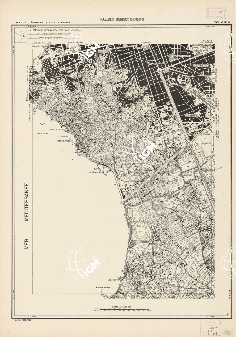 Paris. – Service Géographique de l'Arme 1914-1918. – Questi piani sono stati allestiti durante la guerra mondiale da i "Groupes de Canevas de Tir aux Armées". Su di essi venivano riportate le sistemazioni difensive amiche e nemiche e le varie opere militari. Nelle regioni in cui esistevano le carte alla scala 1:10.000, provenienti da rilievi diretti, queste costituivano la base dei plans directeurs, mentre altrove essi erano dedotti dai piani catastali al 10.000 inquadrati nelle reti dei punti trigonometrici, introducendo per la rappresentazione dell'orografia le linee di livello ricavate dall'ingrandimento dei rilevamenti alla scala 1:40.000. Poichè con tale sistema non si aveva una esatta rappresentazione del terreno, a cura dei "Groupes de Canevas de Tir" fu provveduto, in molte zone, all'esecuzione dei rilievi regolari alla scala 1:10.000. Di tali piani esistono diverse edizioni con formato variabile: una edizione in nero con orografia rappresentata a curve di livello all'equidistanza di m.5 con quadrettatura chilometrica-sistema Lambert; altre edizioni: in nero con curve di livello in bistro, e policrome, sono senza quadrettatura.