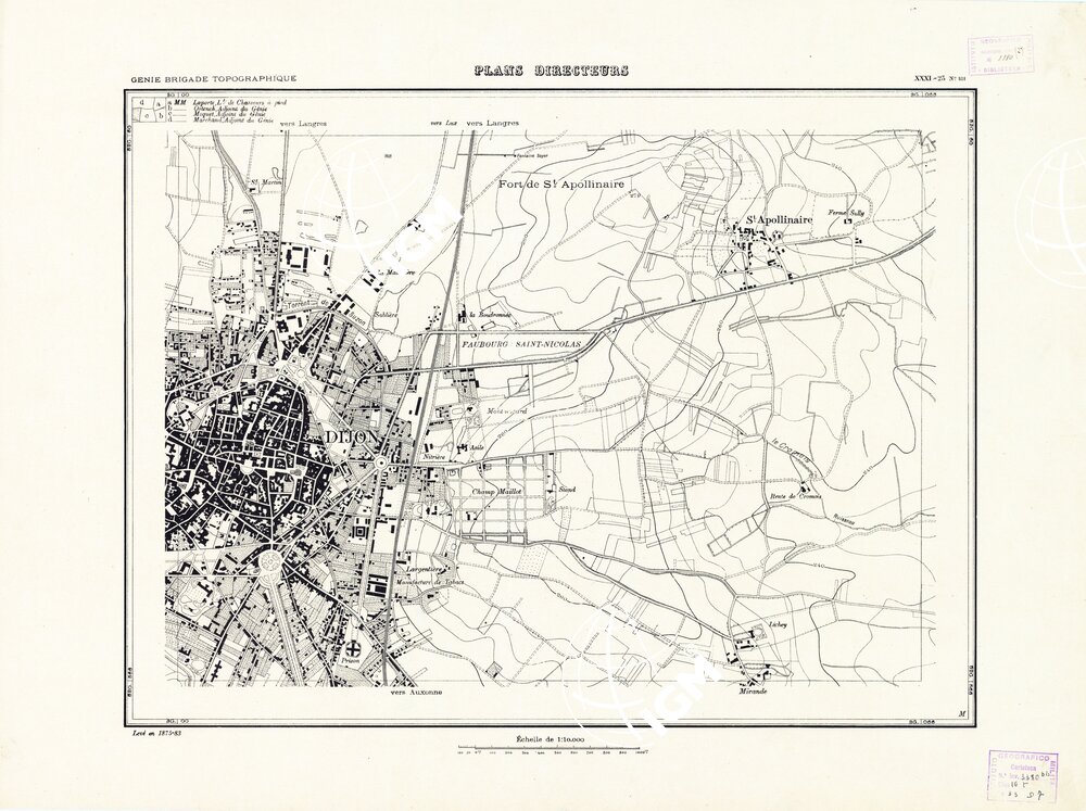 Paris. – Service Géographique de l'Arme 1914-1918. – Questi piani sono stati allestiti durante la guerra mondiale da i "Groupes de Canevas de Tir aux Armées". Su di essi venivano riportate le sistemazioni difensive amiche e nemiche e le varie opere militari. Nelle regioni in cui esistevano le carte alla scala 1:10.000, provenienti da rilievi diretti, queste costituivano la base dei plans directeurs, mentre altrove essi erano dedotti dai piani catastali al 10.000 inquadrati nelle reti dei punti trigonometrici, introducendo per la rappresentazione dell'orografia le linee di livello ricavate dall'ingrandimento dei rilevamenti alla scala 1:40.000. Poichè con tale sistema non si aveva una esatta rappresentazione del terreno, a cura dei "Groupes de Canevas de Tir" fu provveduto, in molte zone, all'esecuzione dei rilievi regolari alla scala 1:10.000. Di tali piani esistono diverse edizioni con formato variabile: una edizione in nero con orografia rappresentata a curve di livello all'equidistanza di m.5 con quadrettatura chilometrica-sistema Lambert; altre edizioni: in nero con curve di livello in bistro, e policrome, sono senza quadrettatura.
