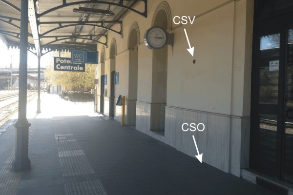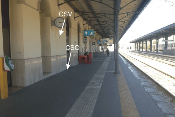 [{"simbolo_contrassegno":"P3","materializzazione":"(CSO) – Chiusino in ghisa posto alla base della facciata lato binari, a sinistra dell'ultima porta di sinistra del corpo principale del fabbricato"},{"simbolo_contrassegno":"V1","materializzazione":"(CSV) – Mensola infissa sulla stessa facciata, in corrispondenza del CSO"}]