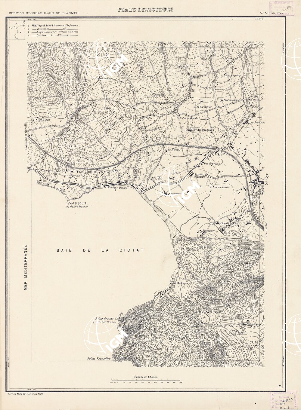 Paris. – Service Géographique de l'Arme 1914-1918. – Questi piani sono stati allestiti durante la guerra mondiale da i "Groupes de Canevas de Tir aux Armées". Su di essi venivano riportate le sistemazioni difensive amiche e nemiche e le varie opere militari. Nelle regioni in cui esistevano le carte alla scala 1:10.000, provenienti da rilievi diretti, queste costituivano la base dei plans directeurs, mentre altrove essi erano dedotti dai piani catastali al 10.000 inquadrati nelle reti dei punti trigonometrici, introducendo per la rappresentazione dell'orografia le linee di livello ricavate dall'ingrandimento dei rilevamenti alla scala 1:40.000. Poichè con tale sistema non si aveva una esatta rappresentazione del terreno, a cura dei "Groupes de Canevas de Tir" fu provveduto, in molte zone, all'esecuzione dei rilievi regolari alla scala 1:10.000. Di tali piani esistono diverse edizioni con formato variabile: una edizione in nero con orografia rappresentata a curve di livello all'equidistanza di m.5 con quadrettatura chilometrica-sistema Lambert; altre edizioni: in nero con curve di livello in bistro, e policrome, sono senza quadrettatura.