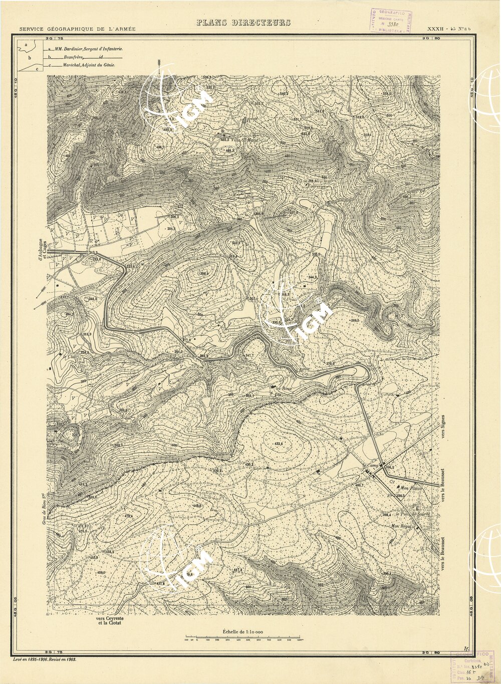 Paris. – Service Géographique de l'Arme 1914-1918. – Questi piani sono stati allestiti durante la guerra mondiale da i "Groupes de Canevas de Tir aux Armées". Su di essi venivano riportate le sistemazioni difensive amiche e nemiche e le varie opere militari. Nelle regioni in cui esistevano le carte alla scala 1:10.000, provenienti da rilievi diretti, queste costituivano la base dei plans directeurs, mentre altrove essi erano dedotti dai piani catastali al 10.000 inquadrati nelle reti dei punti trigonometrici, introducendo per la rappresentazione dell'orografia le linee di livello ricavate dall'ingrandimento dei rilevamenti alla scala 1:40.000. Poichè con tale sistema non si aveva una esatta rappresentazione del terreno, a cura dei "Groupes de Canevas de Tir" fu provveduto, in molte zone, all'esecuzione dei rilievi regolari alla scala 1:10.000. Di tali piani esistono diverse edizioni con formato variabile: una edizione in nero con orografia rappresentata a curve di livello all'equidistanza di m.5 con quadrettatura chilometrica-sistema Lambert; altre edizioni: in nero con curve di livello in bistro, e policrome, sono senza quadrettatura.