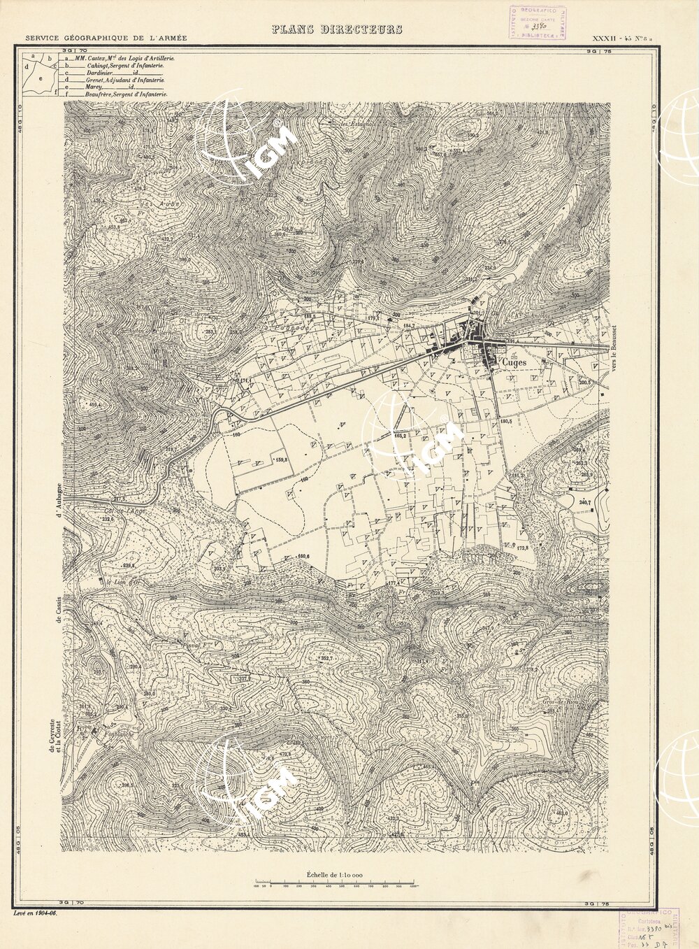 Paris. – Service Géographique de l'Arme 1914-1918. – Questi piani sono stati allestiti durante la guerra mondiale da i "Groupes de Canevas de Tir aux Armées". Su di essi venivano riportate le sistemazioni difensive amiche e nemiche e le varie opere militari. Nelle regioni in cui esistevano le carte alla scala 1:10.000, provenienti da rilievi diretti, queste costituivano la base dei plans directeurs, mentre altrove essi erano dedotti dai piani catastali al 10.000 inquadrati nelle reti dei punti trigonometrici, introducendo per la rappresentazione dell'orografia le linee di livello ricavate dall'ingrandimento dei rilevamenti alla scala 1:40.000. Poichè con tale sistema non si aveva una esatta rappresentazione del terreno, a cura dei "Groupes de Canevas de Tir" fu provveduto, in molte zone, all'esecuzione dei rilievi regolari alla scala 1:10.000. Di tali piani esistono diverse edizioni con formato variabile: una edizione in nero con orografia rappresentata a curve di livello all'equidistanza di m.5 con quadrettatura chilometrica-sistema Lambert; altre edizioni: in nero con curve di livello in bistro, e policrome, sono senza quadrettatura.