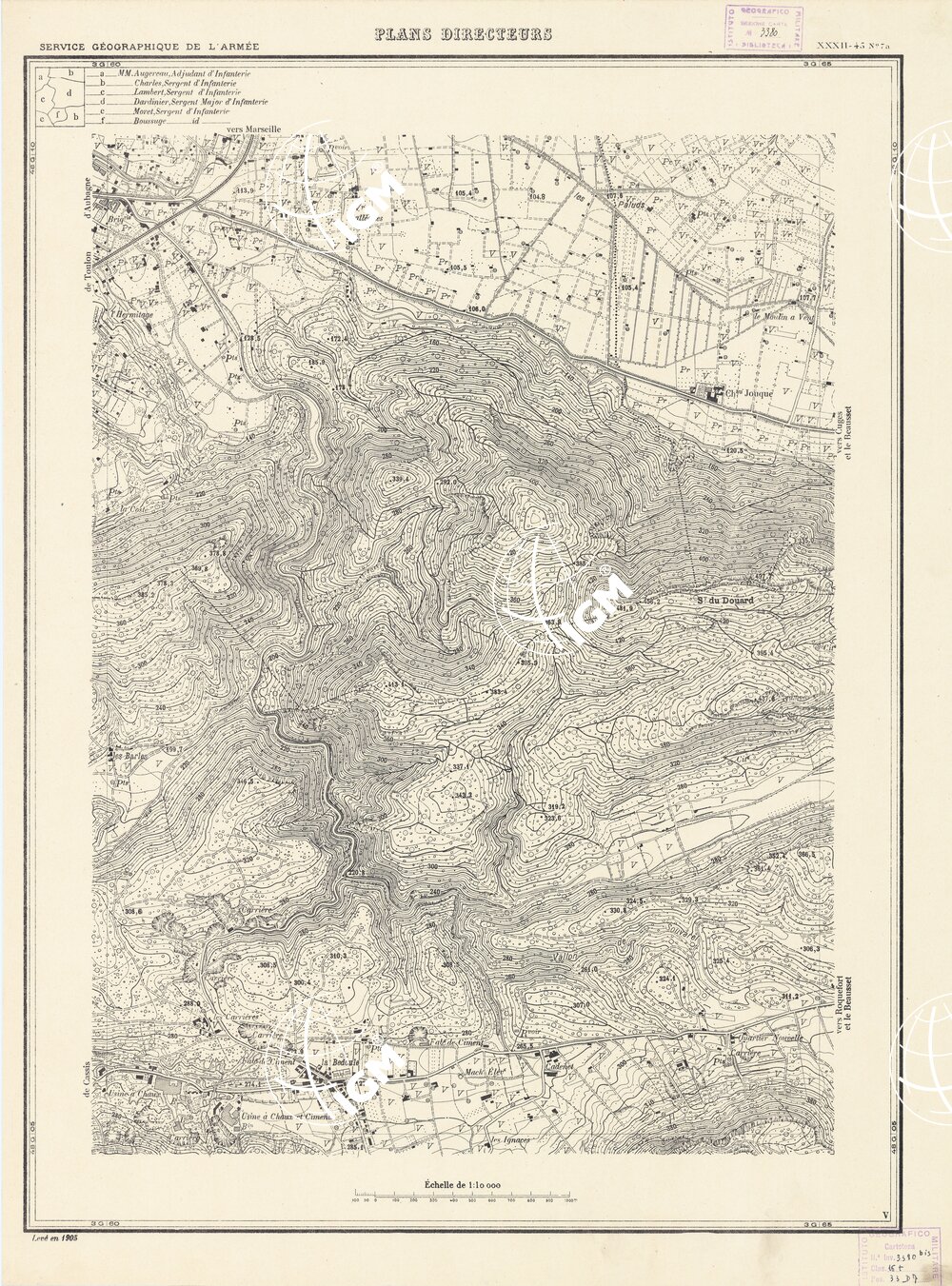 Paris. – Service Géographique de l'Arme 1914-1918. – Questi piani sono stati allestiti durante la guerra mondiale da i "Groupes de Canevas de Tir aux Armées". Su di essi venivano riportate le sistemazioni difensive amiche e nemiche e le varie opere militari. Nelle regioni in cui esistevano le carte alla scala 1:10.000, provenienti da rilievi diretti, queste costituivano la base dei plans directeurs, mentre altrove essi erano dedotti dai piani catastali al 10.000 inquadrati nelle reti dei punti trigonometrici, introducendo per la rappresentazione dell'orografia le linee di livello ricavate dall'ingrandimento dei rilevamenti alla scala 1:40.000. Poichè con tale sistema non si aveva una esatta rappresentazione del terreno, a cura dei "Groupes de Canevas de Tir" fu provveduto, in molte zone, all'esecuzione dei rilievi regolari alla scala 1:10.000. Di tali piani esistono diverse edizioni con formato variabile: una edizione in nero con orografia rappresentata a curve di livello all'equidistanza di m.5 con quadrettatura chilometrica-sistema Lambert; altre edizioni: in nero con curve di livello in bistro, e policrome, sono senza quadrettatura.