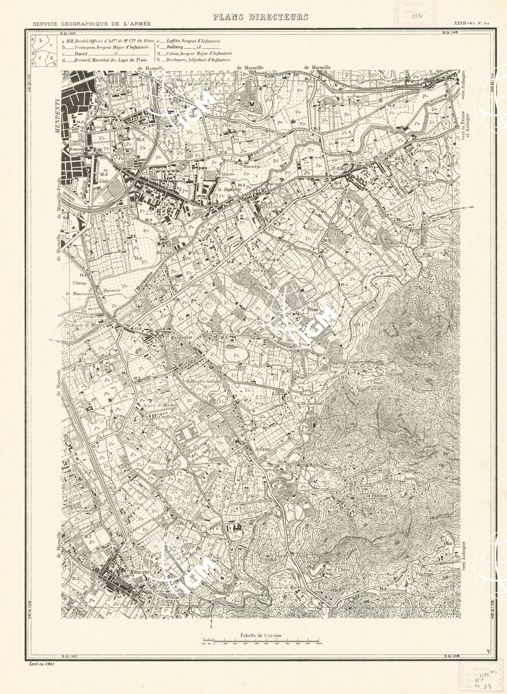 Paris. – Service Géographique de l'Arme 1914-1918. – Questi piani sono stati allestiti durante la guerra mondiale da i "Groupes de Canevas de Tir aux Armées". Su di essi venivano riportate le sistemazioni difensive amiche e nemiche e le varie opere militari. Nelle regioni in cui esistevano le carte alla scala 1:10.000, provenienti da rilievi diretti, queste costituivano la base dei plans directeurs, mentre altrove essi erano dedotti dai piani catastali al 10.000 inquadrati nelle reti dei punti trigonometrici, introducendo per la rappresentazione dell'orografia le linee di livello ricavate dall'ingrandimento dei rilevamenti alla scala 1:40.000. Poichè con tale sistema non si aveva una esatta rappresentazione del terreno, a cura dei "Groupes de Canevas de Tir" fu provveduto, in molte zone, all'esecuzione dei rilievi regolari alla scala 1:10.000. Di tali piani esistono diverse edizioni con formato variabile: una edizione in nero con orografia rappresentata a curve di livello all'equidistanza di m.5 con quadrettatura chilometrica-sistema Lambert; altre edizioni: in nero con curve di livello in bistro, e policrome, sono senza quadrettatura.
