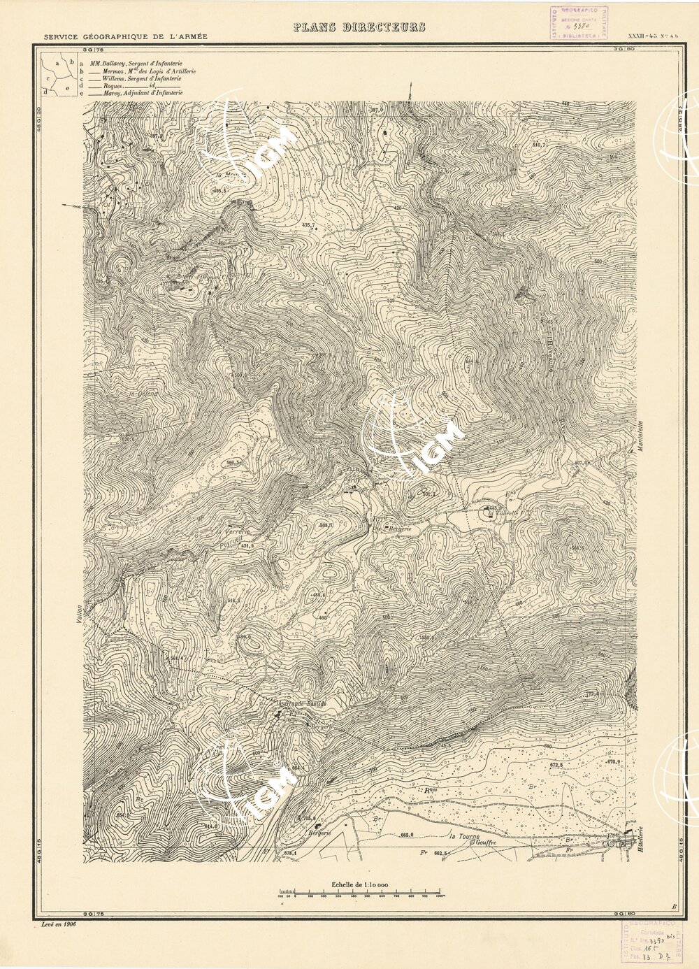 Paris. – Service Géographique de l'Arme 1914-1918. – Questi piani sono stati allestiti durante la guerra mondiale da i "Groupes de Canevas de Tir aux Armées". Su di essi venivano riportate le sistemazioni difensive amiche e nemiche e le varie opere militari. Nelle regioni in cui esistevano le carte alla scala 1:10.000, provenienti da rilievi diretti, queste costituivano la base dei plans directeurs, mentre altrove essi erano dedotti dai piani catastali al 10.000 inquadrati nelle reti dei punti trigonometrici, introducendo per la rappresentazione dell'orografia le linee di livello ricavate dall'ingrandimento dei rilevamenti alla scala 1:40.000. Poichè con tale sistema non si aveva una esatta rappresentazione del terreno, a cura dei "Groupes de Canevas de Tir" fu provveduto, in molte zone, all'esecuzione dei rilievi regolari alla scala 1:10.000. Di tali piani esistono diverse edizioni con formato variabile: una edizione in nero con orografia rappresentata a curve di livello all'equidistanza di m.5 con quadrettatura chilometrica-sistema Lambert; altre edizioni: in nero con curve di livello in bistro, e policrome, sono senza quadrettatura.