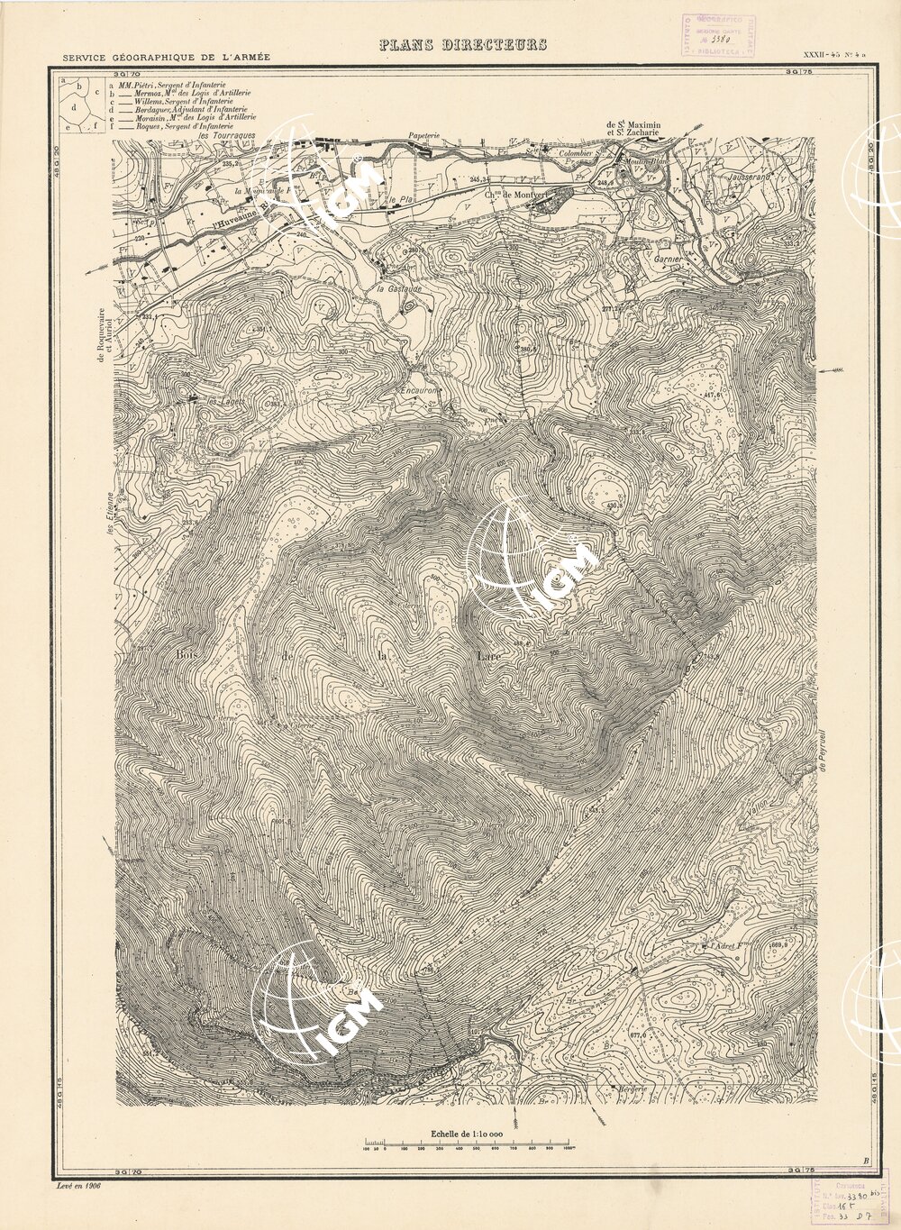 Paris. – Service Géographique de l'Arme 1914-1918. – Questi piani sono stati allestiti durante la guerra mondiale da i "Groupes de Canevas de Tir aux Armées". Su di essi venivano riportate le sistemazioni difensive amiche e nemiche e le varie opere militari. Nelle regioni in cui esistevano le carte alla scala 1:10.000, provenienti da rilievi diretti, queste costituivano la base dei plans directeurs, mentre altrove essi erano dedotti dai piani catastali al 10.000 inquadrati nelle reti dei punti trigonometrici, introducendo per la rappresentazione dell'orografia le linee di livello ricavate dall'ingrandimento dei rilevamenti alla scala 1:40.000. Poichè con tale sistema non si aveva una esatta rappresentazione del terreno, a cura dei "Groupes de Canevas de Tir" fu provveduto, in molte zone, all'esecuzione dei rilievi regolari alla scala 1:10.000. Di tali piani esistono diverse edizioni con formato variabile: una edizione in nero con orografia rappresentata a curve di livello all'equidistanza di m.5 con quadrettatura chilometrica-sistema Lambert; altre edizioni: in nero con curve di livello in bistro, e policrome, sono senza quadrettatura.