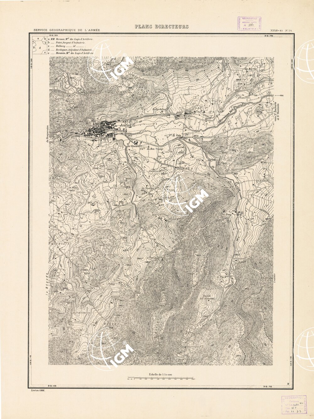 Paris. – Service Géographique de l'Arme 1914-1918. – Questi piani sono stati allestiti durante la guerra mondiale da i "Groupes de Canevas de Tir aux Armées". Su di essi venivano riportate le sistemazioni difensive amiche e nemiche e le varie opere militari. Nelle regioni in cui esistevano le carte alla scala 1:10.000, provenienti da rilievi diretti, queste costituivano la base dei plans directeurs, mentre altrove essi erano dedotti dai piani catastali al 10.000 inquadrati nelle reti dei punti trigonometrici, introducendo per la rappresentazione dell'orografia le linee di livello ricavate dall'ingrandimento dei rilevamenti alla scala 1:40.000. Poichè con tale sistema non si aveva una esatta rappresentazione del terreno, a cura dei "Groupes de Canevas de Tir" fu provveduto, in molte zone, all'esecuzione dei rilievi regolari alla scala 1:10.000. Di tali piani esistono diverse edizioni con formato variabile: una edizione in nero con orografia rappresentata a curve di livello all'equidistanza di m.5 con quadrettatura chilometrica-sistema Lambert; altre edizioni: in nero con curve di livello in bistro, e policrome, sono senza quadrettatura.