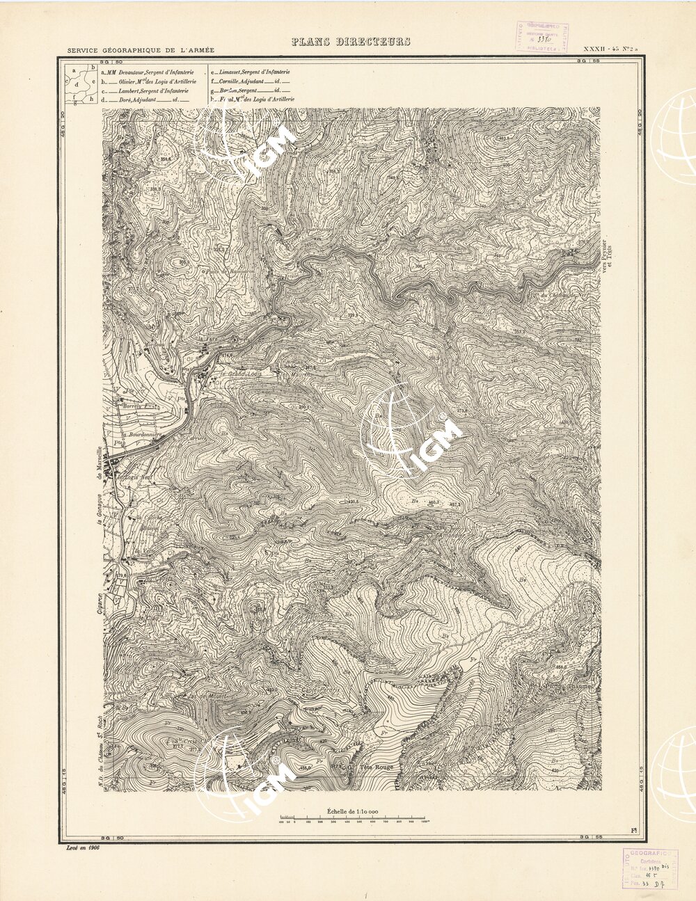 Paris. – Service Géographique de l'Arme 1914-1918. – Questi piani sono stati allestiti durante la guerra mondiale da i "Groupes de Canevas de Tir aux Armées". Su di essi venivano riportate le sistemazioni difensive amiche e nemiche e le varie opere militari. Nelle regioni in cui esistevano le carte alla scala 1:10.000, provenienti da rilievi diretti, queste costituivano la base dei plans directeurs, mentre altrove essi erano dedotti dai piani catastali al 10.000 inquadrati nelle reti dei punti trigonometrici, introducendo per la rappresentazione dell'orografia le linee di livello ricavate dall'ingrandimento dei rilevamenti alla scala 1:40.000. Poichè con tale sistema non si aveva una esatta rappresentazione del terreno, a cura dei "Groupes de Canevas de Tir" fu provveduto, in molte zone, all'esecuzione dei rilievi regolari alla scala 1:10.000. Di tali piani esistono diverse edizioni con formato variabile: una edizione in nero con orografia rappresentata a curve di livello all'equidistanza di m.5 con quadrettatura chilometrica-sistema Lambert; altre edizioni: in nero con curve di livello in bistro, e policrome, sono senza quadrettatura.