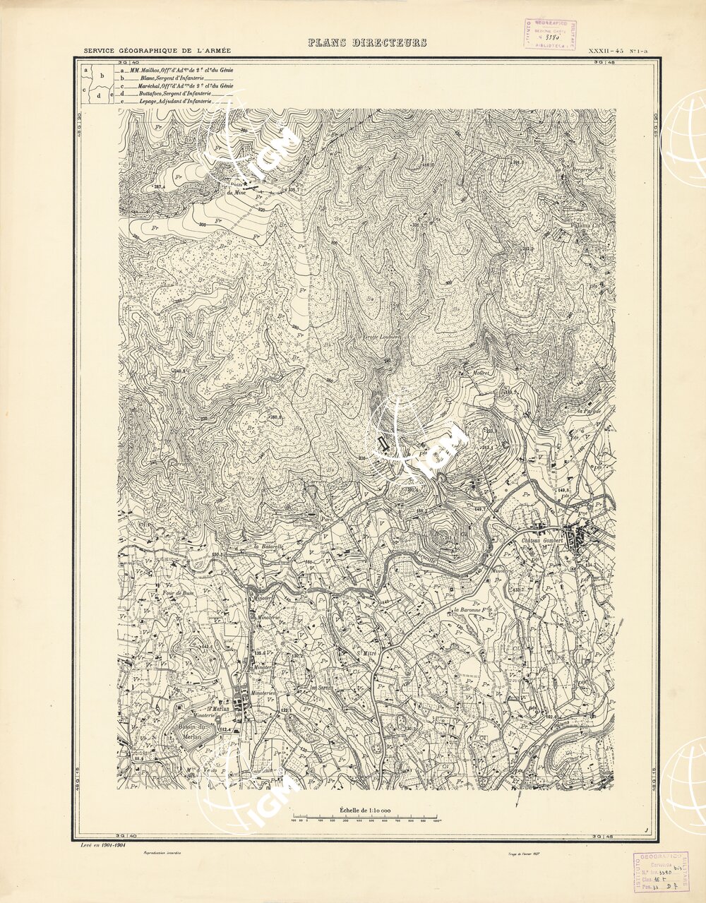 Paris. – Service Géographique de l'Arme 1914-1918. – Questi piani sono stati allestiti durante la guerra mondiale da i "Groupes de Canevas de Tir aux Armées". Su di essi venivano riportate le sistemazioni difensive amiche e nemiche e le varie opere militari. Nelle regioni in cui esistevano le carte alla scala 1:10.000, provenienti da rilievi diretti, queste costituivano la base dei plans directeurs, mentre altrove essi erano dedotti dai piani catastali al 10.000 inquadrati nelle reti dei punti trigonometrici, introducendo per la rappresentazione dell'orografia le linee di livello ricavate dall'ingrandimento dei rilevamenti alla scala 1:40.000. Poichè con tale sistema non si aveva una esatta rappresentazione del terreno, a cura dei "Groupes de Canevas de Tir" fu provveduto, in molte zone, all'esecuzione dei rilievi regolari alla scala 1:10.000. Di tali piani esistono diverse edizioni con formato variabile: una edizione in nero con orografia rappresentata a curve di livello all'equidistanza di m.5 con quadrettatura chilometrica-sistema Lambert; altre edizioni: in nero con curve di livello in bistro, e policrome, sono senza quadrettatura.