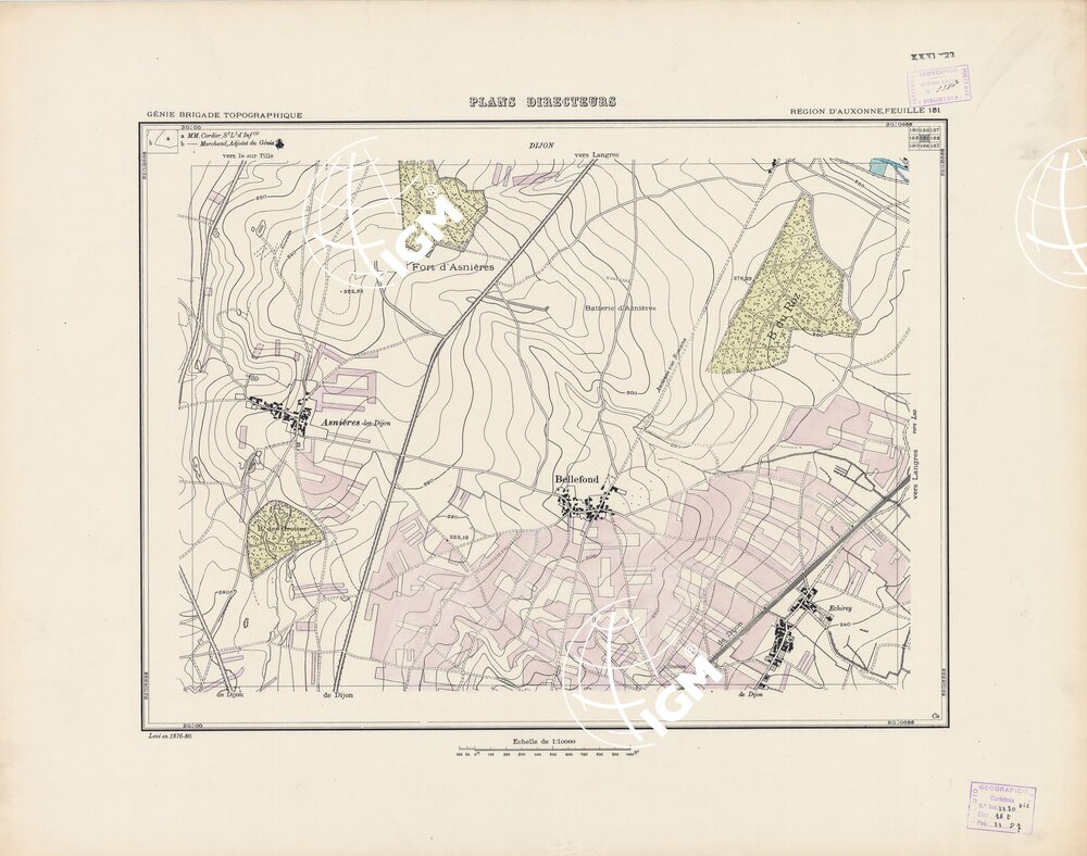 Paris. – Service Géographique de l'Arme 1914-1918. – Questi piani sono stati allestiti durante la guerra mondiale da i "Groupes de Canevas de Tir aux Armées". Su di essi venivano riportate le sistemazioni difensive amiche e nemiche e le varie opere militari. Nelle regioni in cui esistevano le carte alla scala 1:10.000, provenienti da rilievi diretti, queste costituivano la base dei plans directeurs, mentre altrove essi erano dedotti dai piani catastali al 10.000 inquadrati nelle reti dei punti trigonometrici, introducendo per la rappresentazione dell'orografia le linee di livello ricavate dall'ingrandimento dei rilevamenti alla scala 1:40.000. Poichè con tale sistema non si aveva una esatta rappresentazione del terreno, a cura dei "Groupes de Canevas de Tir" fu provveduto, in molte zone, all'esecuzione dei rilievi regolari alla scala 1:10.000. Di tali piani esistono diverse edizioni con formato variabile: una edizione in nero con orografia rappresentata a curve di livello all'equidistanza di m.5 con quadrettatura chilometrica-sistema Lambert; altre edizioni: in nero con curve di livello in bistro, e policrome, sono senza quadrettatura.