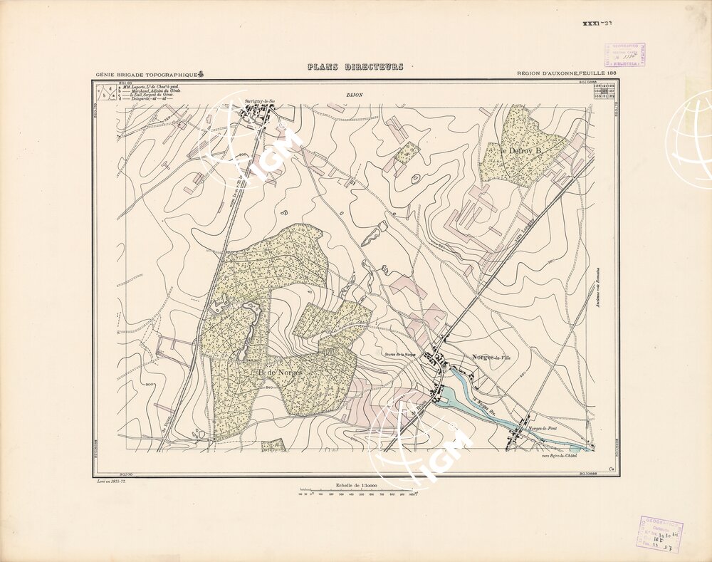 Paris. – Service Géographique de l'Arme 1914-1918. – Questi piani sono stati allestiti durante la guerra mondiale da i "Groupes de Canevas de Tir aux Armées". Su di essi venivano riportate le sistemazioni difensive amiche e nemiche e le varie opere militari. Nelle regioni in cui esistevano le carte alla scala 1:10.000, provenienti da rilievi diretti, queste costituivano la base dei plans directeurs, mentre altrove essi erano dedotti dai piani catastali al 10.000 inquadrati nelle reti dei punti trigonometrici, introducendo per la rappresentazione dell'orografia le linee di livello ricavate dall'ingrandimento dei rilevamenti alla scala 1:40.000. Poichè con tale sistema non si aveva una esatta rappresentazione del terreno, a cura dei "Groupes de Canevas de Tir" fu provveduto, in molte zone, all'esecuzione dei rilievi regolari alla scala 1:10.000. Di tali piani esistono diverse edizioni con formato variabile: una edizione in nero con orografia rappresentata a curve di livello all'equidistanza di m.5 con quadrettatura chilometrica-sistema Lambert; altre edizioni: in nero con curve di livello in bistro, e policrome, sono senza quadrettatura.