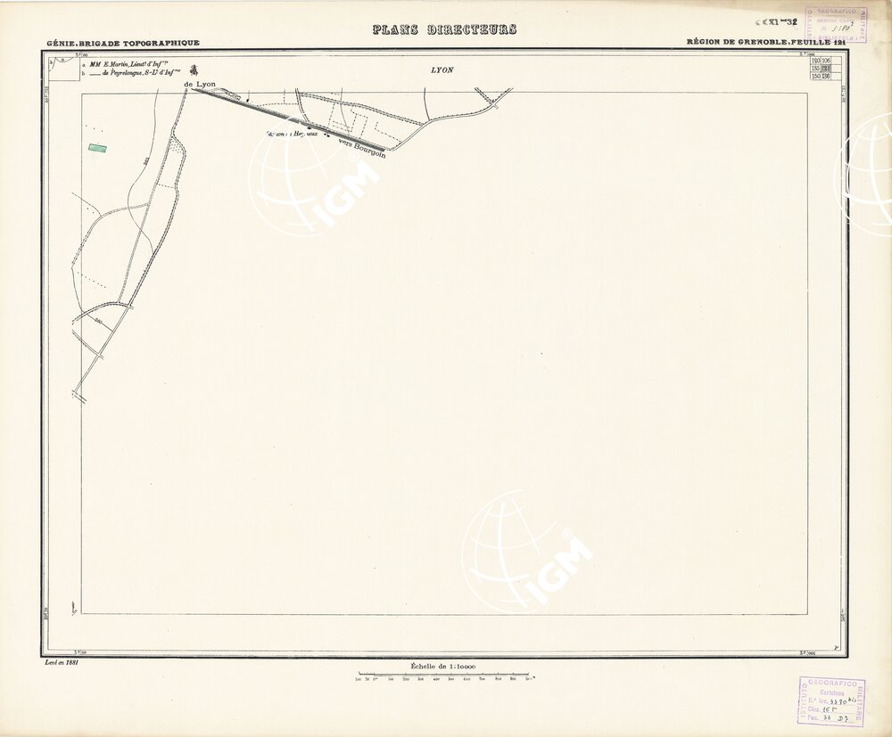 Paris. – Service Géographique de l'Arme 1914-1918. – Questi piani sono stati allestiti durante la guerra mondiale da i "Groupes de Canevas de Tir aux Armées". Su di essi venivano riportate le sistemazioni difensive amiche e nemiche e le varie opere militari. Nelle regioni in cui esistevano le carte alla scala 1:10.000, provenienti da rilievi diretti, queste costituivano la base dei plans directeurs, mentre altrove essi erano dedotti dai piani catastali al 10.000 inquadrati nelle reti dei punti trigonometrici, introducendo per la rappresentazione dell'orografia le linee di livello ricavate dall'ingrandimento dei rilevamenti alla scala 1:40.000. Poichè con tale sistema non si aveva una esatta rappresentazione del terreno, a cura dei "Groupes de Canevas de Tir" fu provveduto, in molte zone, all'esecuzione dei rilievi regolari alla scala 1:10.000. Di tali piani esistono diverse edizioni con formato variabile: una edizione in nero con orografia rappresentata a curve di livello all'equidistanza di m.5 con quadrettatura chilometrica-sistema Lambert; altre edizioni: in nero con curve di livello in bistro, e policrome, sono senza quadrettatura.