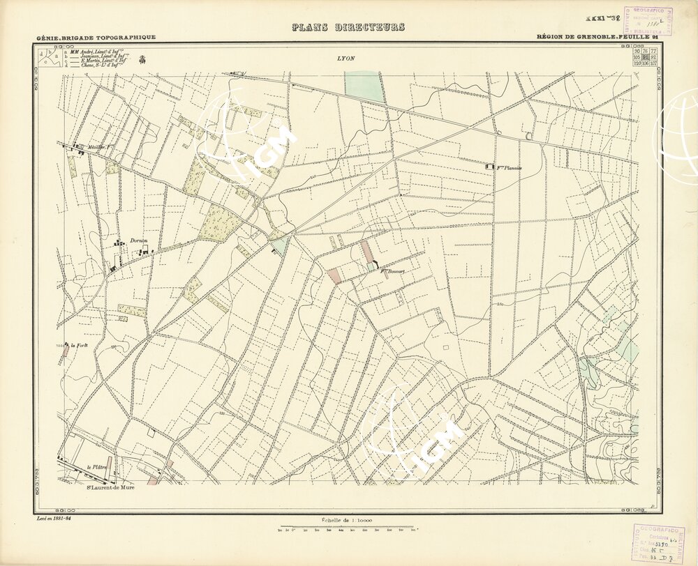 Paris. – Service Géographique de l'Arme 1914-1918. – Questi piani sono stati allestiti durante la guerra mondiale da i "Groupes de Canevas de Tir aux Armées". Su di essi venivano riportate le sistemazioni difensive amiche e nemiche e le varie opere militari. Nelle regioni in cui esistevano le carte alla scala 1:10.000, provenienti da rilievi diretti, queste costituivano la base dei plans directeurs, mentre altrove essi erano dedotti dai piani catastali al 10.000 inquadrati nelle reti dei punti trigonometrici, introducendo per la rappresentazione dell'orografia le linee di livello ricavate dall'ingrandimento dei rilevamenti alla scala 1:40.000. Poichè con tale sistema non si aveva una esatta rappresentazione del terreno, a cura dei "Groupes de Canevas de Tir" fu provveduto, in molte zone, all'esecuzione dei rilievi regolari alla scala 1:10.000. Di tali piani esistono diverse edizioni con formato variabile: una edizione in nero con orografia rappresentata a curve di livello all'equidistanza di m.5 con quadrettatura chilometrica-sistema Lambert; altre edizioni: in nero con curve di livello in bistro, e policrome, sono senza quadrettatura.