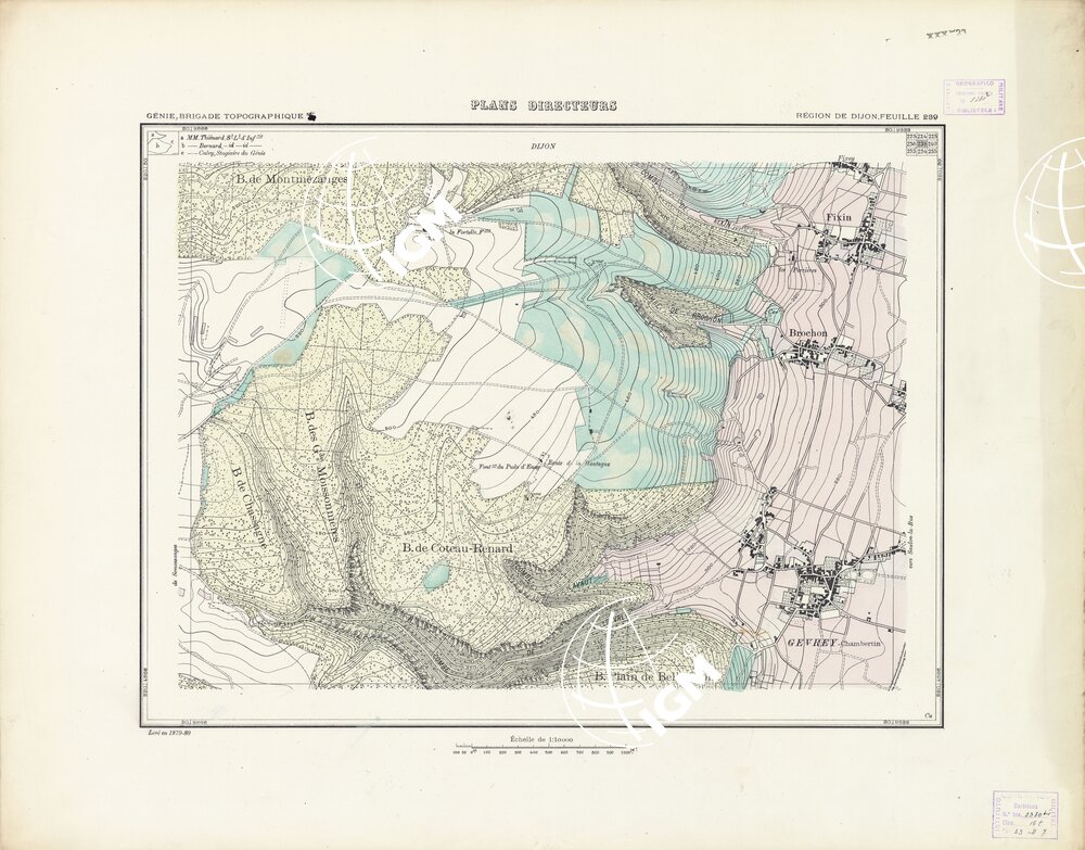 Paris. – Service Géographique de l'Arme 1914-1918. – Questi piani sono stati allestiti durante la guerra mondiale da i "Groupes de Canevas de Tir aux Armées". Su di essi venivano riportate le sistemazioni difensive amiche e nemiche e le varie opere militari. Nelle regioni in cui esistevano le carte alla scala 1:10.000, provenienti da rilievi diretti, queste costituivano la base dei plans directeurs, mentre altrove essi erano dedotti dai piani catastali al 10.000 inquadrati nelle reti dei punti trigonometrici, introducendo per la rappresentazione dell'orografia le linee di livello ricavate dall'ingrandimento dei rilevamenti alla scala 1:40.000. Poichè con tale sistema non si aveva una esatta rappresentazione del terreno, a cura dei "Groupes de Canevas de Tir" fu provveduto, in molte zone, all'esecuzione dei rilievi regolari alla scala 1:10.000. Di tali piani esistono diverse edizioni con formato variabile: una edizione in nero con orografia rappresentata a curve di livello all'equidistanza di m.5 con quadrettatura chilometrica-sistema Lambert; altre edizioni: in nero con curve di livello in bistro, e policrome, sono senza quadrettatura.