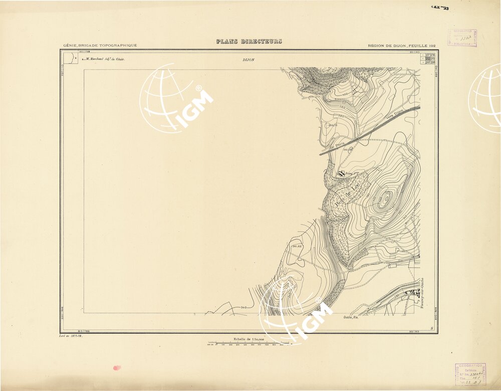 Paris. – Service Géographique de l'Arme 1914-1918. – Questi piani sono stati allestiti durante la guerra mondiale da i "Groupes de Canevas de Tir aux Armées". Su di essi venivano riportate le sistemazioni difensive amiche e nemiche e le varie opere militari. Nelle regioni in cui esistevano le carte alla scala 1:10.000, provenienti da rilievi diretti, queste costituivano la base dei plans directeurs, mentre altrove essi erano dedotti dai piani catastali al 10.000 inquadrati nelle reti dei punti trigonometrici, introducendo per la rappresentazione dell'orografia le linee di livello ricavate dall'ingrandimento dei rilevamenti alla scala 1:40.000. Poichè con tale sistema non si aveva una esatta rappresentazione del terreno, a cura dei "Groupes de Canevas de Tir" fu provveduto, in molte zone, all'esecuzione dei rilievi regolari alla scala 1:10.000. Di tali piani esistono diverse edizioni con formato variabile: una edizione in nero con orografia rappresentata a curve di livello all'equidistanza di m.5 con quadrettatura chilometrica-sistema Lambert; altre edizioni: in nero con curve di livello in bistro, e policrome, sono senza quadrettatura.